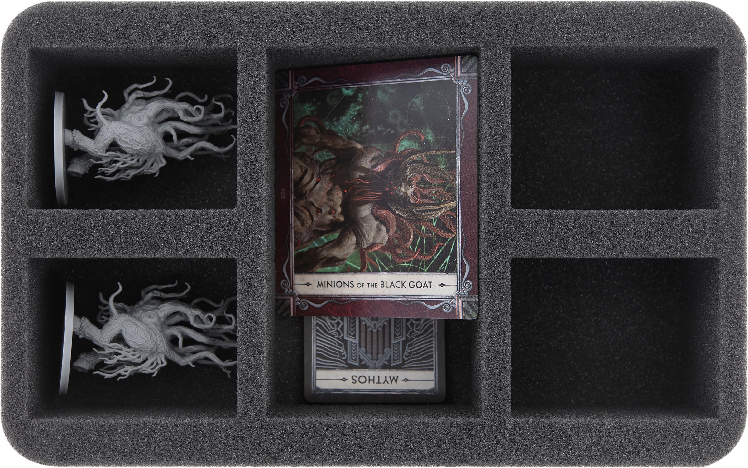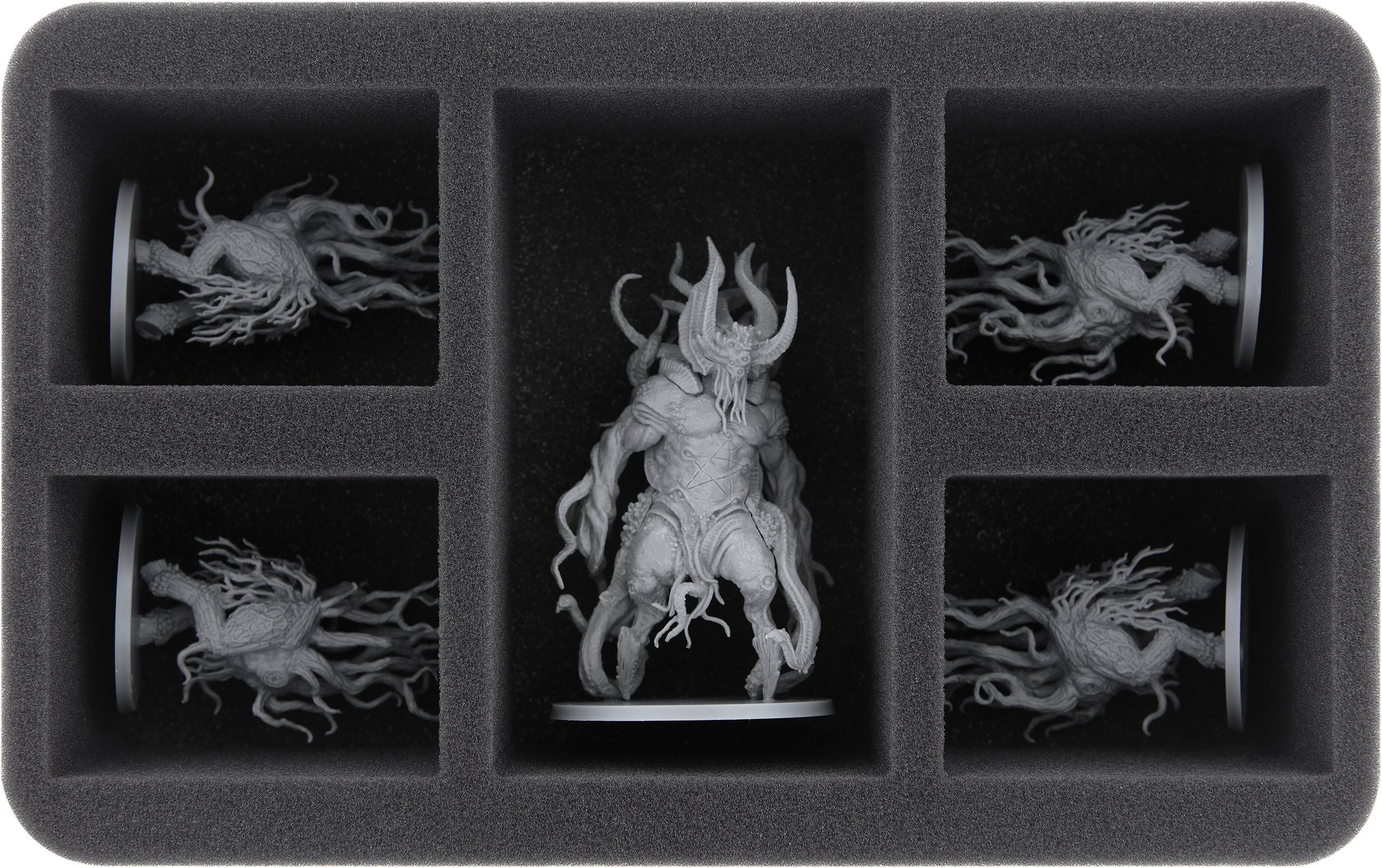 Die Höhere der beiden Schaumstoffeinlagen kümmert sich um die große Miniatur des Black Goat of the Woods und vier Figuren seiner Gefolgschaft. Der passgenaue Zuschnitt sorgt für den optimalen Schutz der Miniaturen. Diese liegen sicher in ihrem Fach aus weichem Schaumstoff. Dadurch werden nicht nur die empfindlichen Details, wie die Tentakel, vor Schäden bewahrt. Auch die Farben der fertig bemalten Miniatur bleiben unversehrt.
