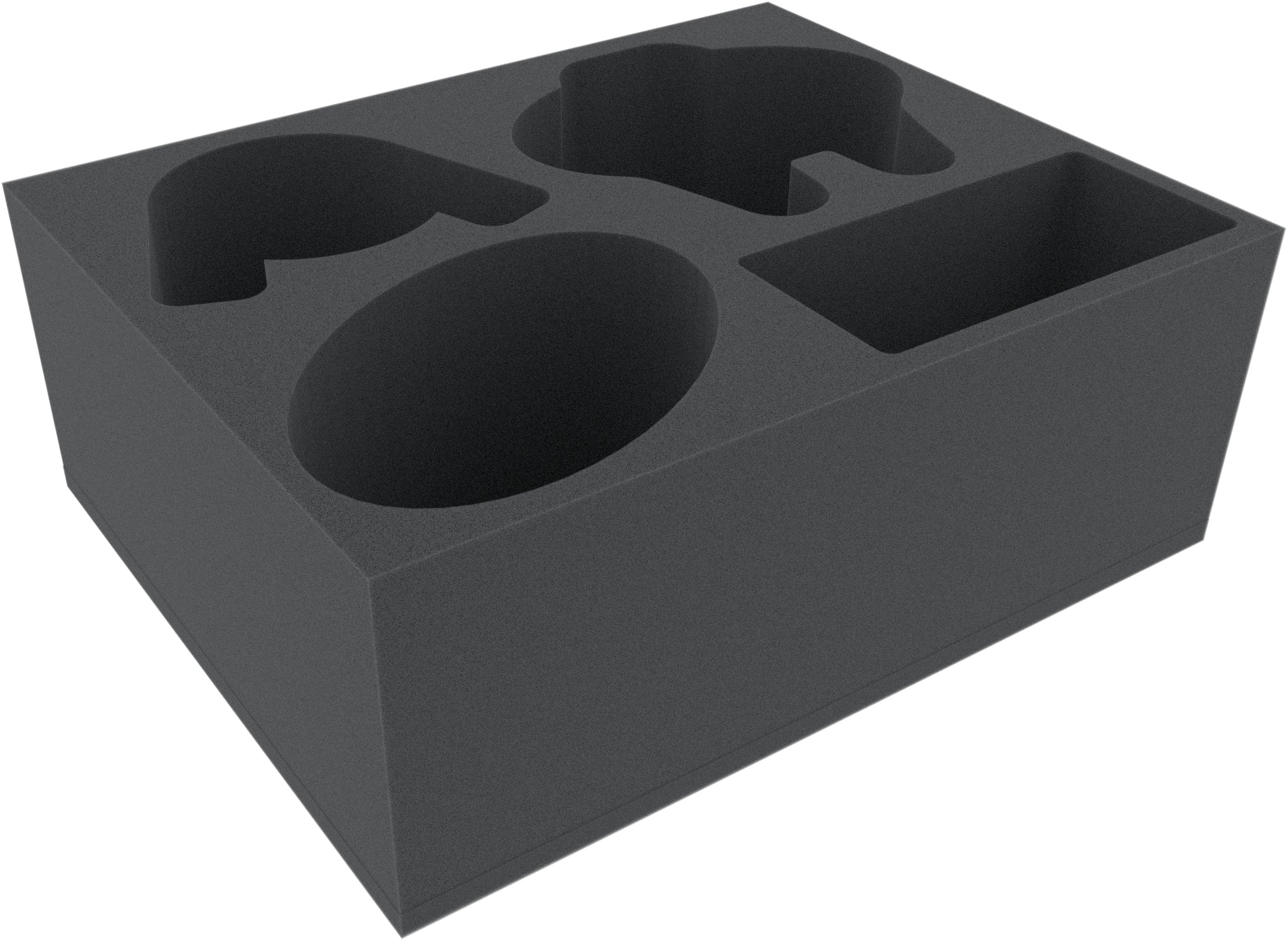 Die Einlage ist unterteilt in 4 individuell zugeschnittene Fächer. Ein großes Modell (z. B. Knight Castellan, Knight Preceptor Canis Rex oder Knight Valiant) lässt sich hier in zwei Teilen – Oberteil mit Waffeneinheit und Unterteil mit Laufeinheit – sicher verstauen. Umgeben von Schaumstoff sind die empfindlichen Teile der Miniatur, auch während des Transports, bestens geschützt.