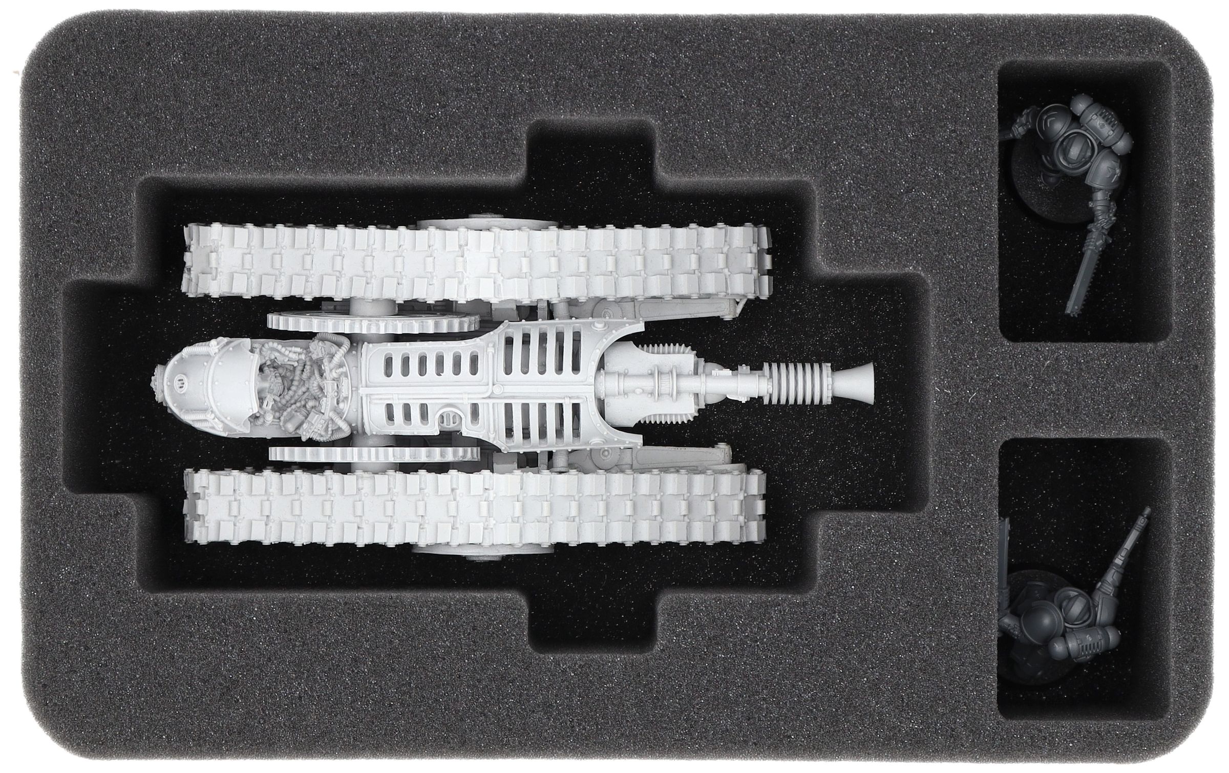 Auf dieser Feldherr Schaumstoffeinlage hast du Platz für bis zu 3 Miniaturen deiner Armee. Das große Fach eignet sich ideal zur Aufbewahrung von großen Modellen, wie beispielsweise einem Mechanicum Krios Battle Tank. Die beiden angrenzenden Fächer bieten Platz für zwei kleinere Modelle.