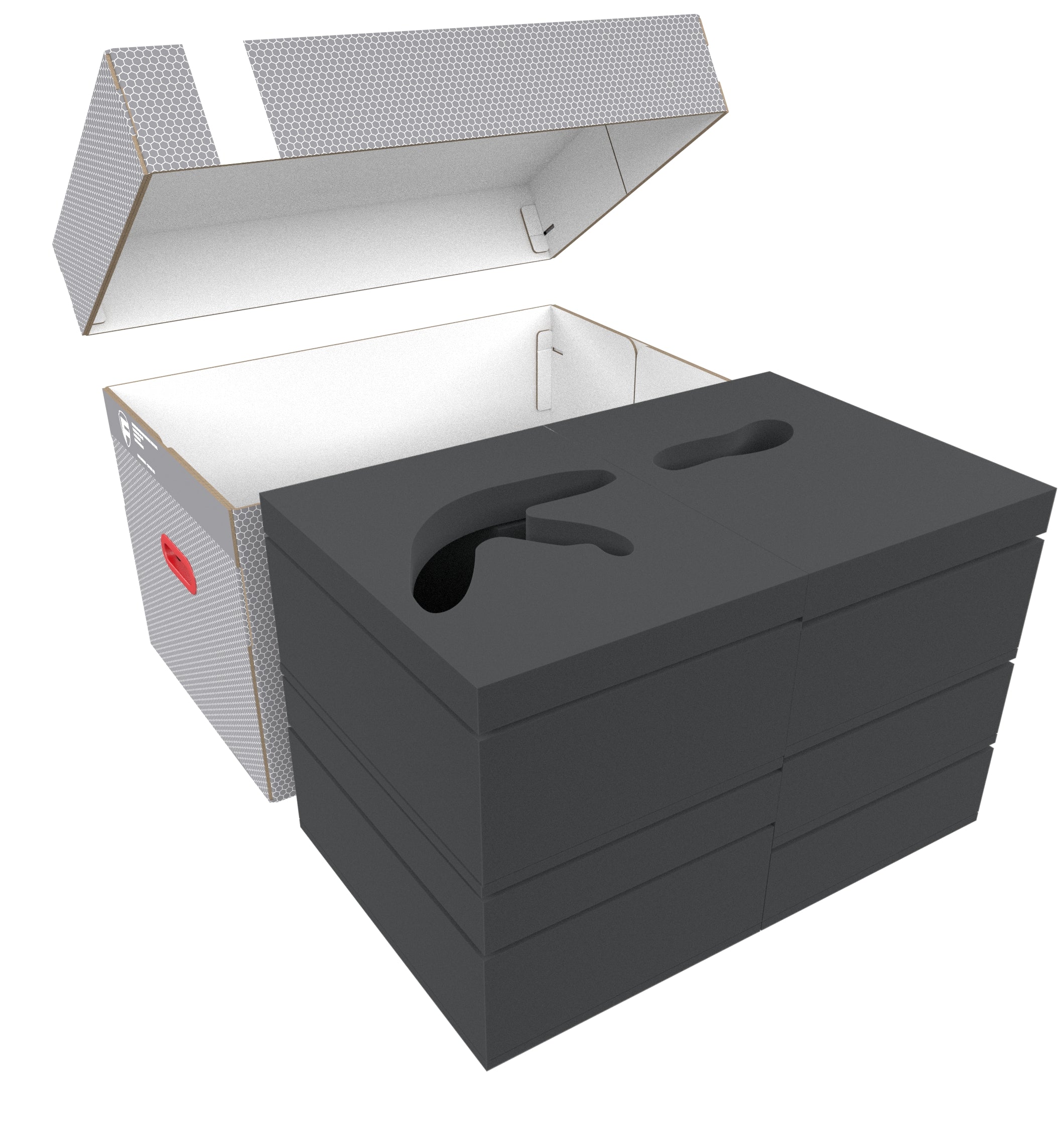 Die Einlagen kannst du bequem in der Lagerbox stapeln. Zusätzlich liefern wir zwei Schaumstoffdeckel mit – einen als Höhenausgleich, und einen als Abdeckung, damit nichts aus den Einlagen fallen kann.