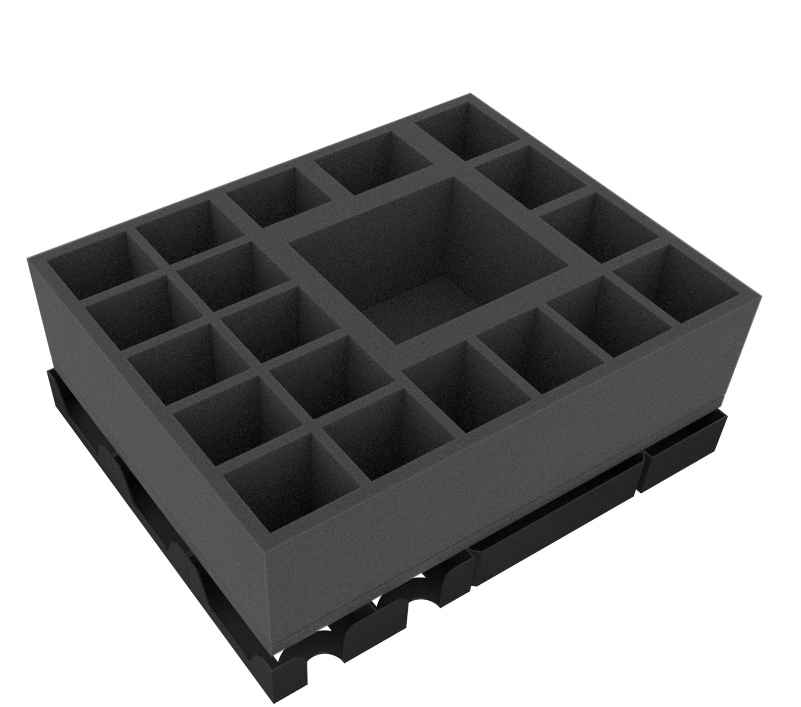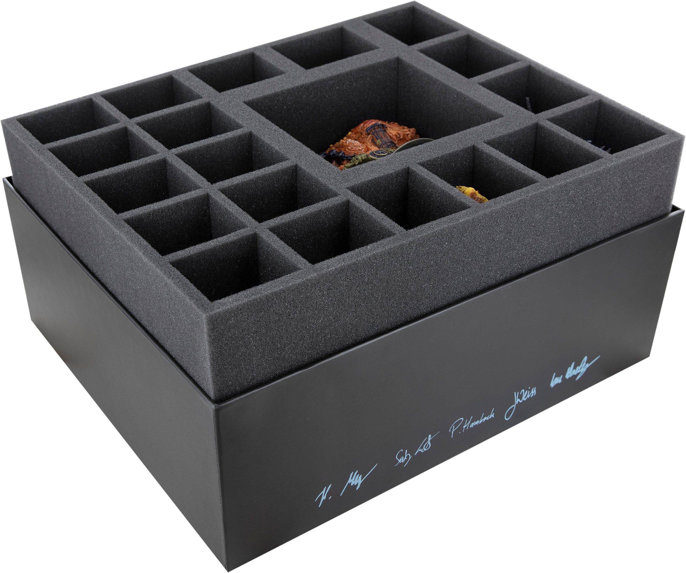 - 1 Schaumstoffeinlage mit 20 Fächern für Heldenminiaturen wie Death, War, Fury und Strife, sowie große Miniaturen wie Jailer Boss und sperrige Miniaturen.