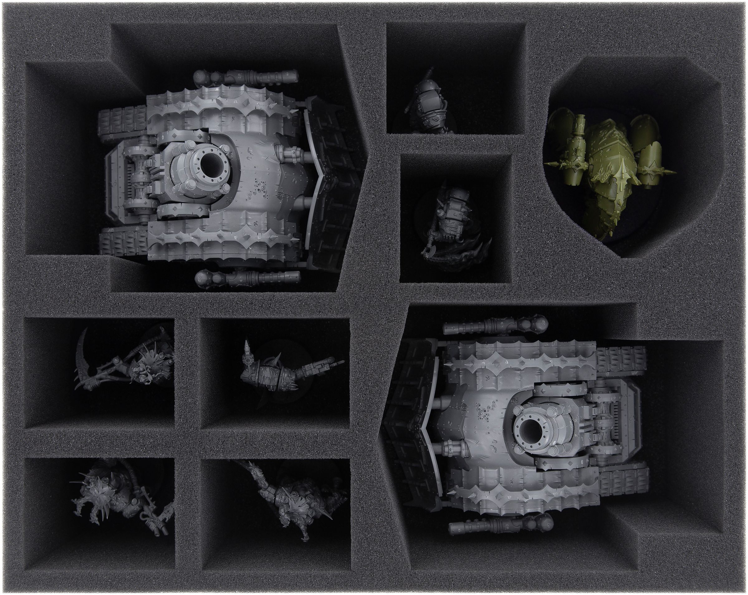 - 1 Full-Size Schaumstoffeinlage mit 3 miniaturengenau geschnittenen Fächern für zwei Panzer der Death Guard, Myphitic Blight-hauler + 6 Fächer für Deathshroud Bodyguards, Poxwalker, Plague Marines und Modelle mit ähnlichen Abmessungen (FSMEFM090BO)