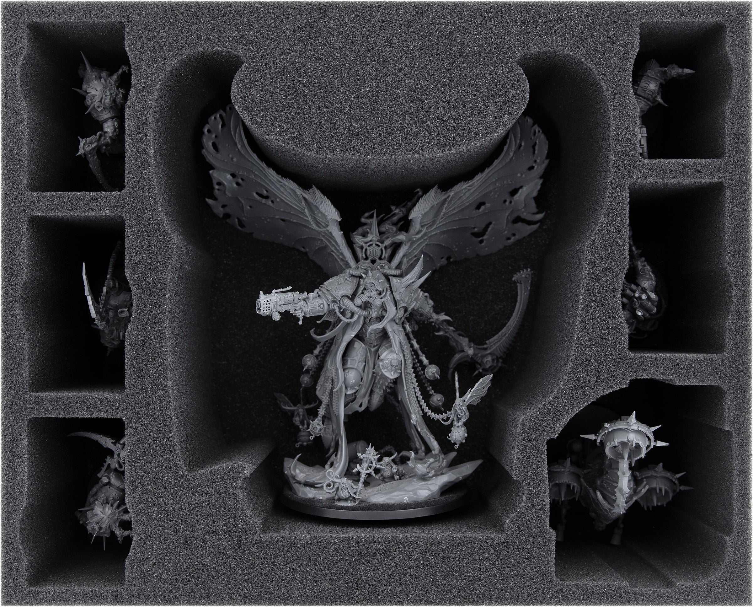 Die 120 mm hohe Full-Size Schaumstoffeinlage sorgt mit einem exakt auf Mortarion zugeschnittenem Fach für den optimalen Schutz des Death Lord. Die gewaltigen Schwingen, die Sense und die Nurgling-Drohnen bleiben so auch zukünftig unversehrt.