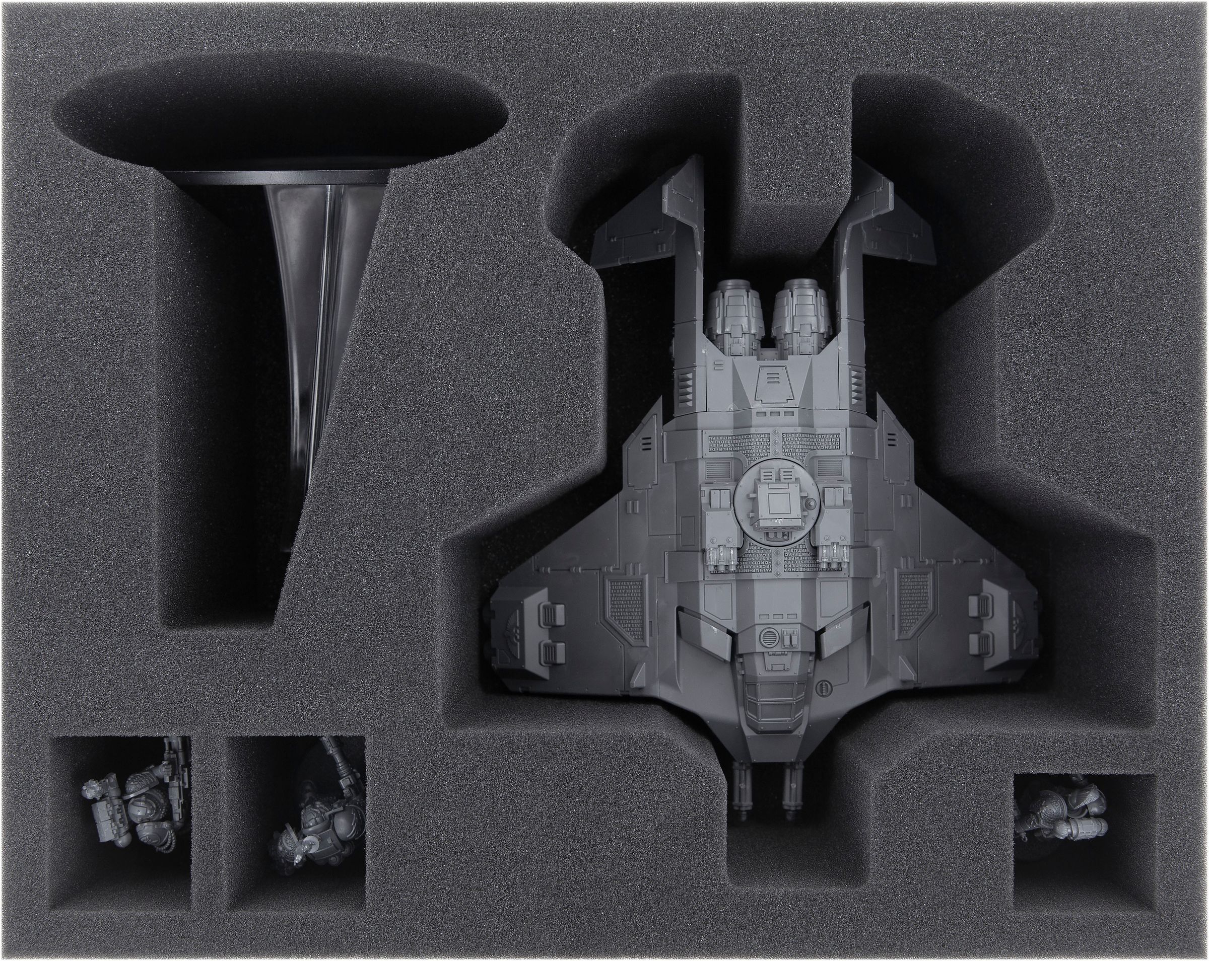 - 1 Full-Size-Schaumstoffeinlage mit 5 Fächern für einen Corvus Blackstar und drei kleinere Miniaturen wie einen Watchmaster oder ein Deathwatch Kill Team (FSMEPX105BO)
