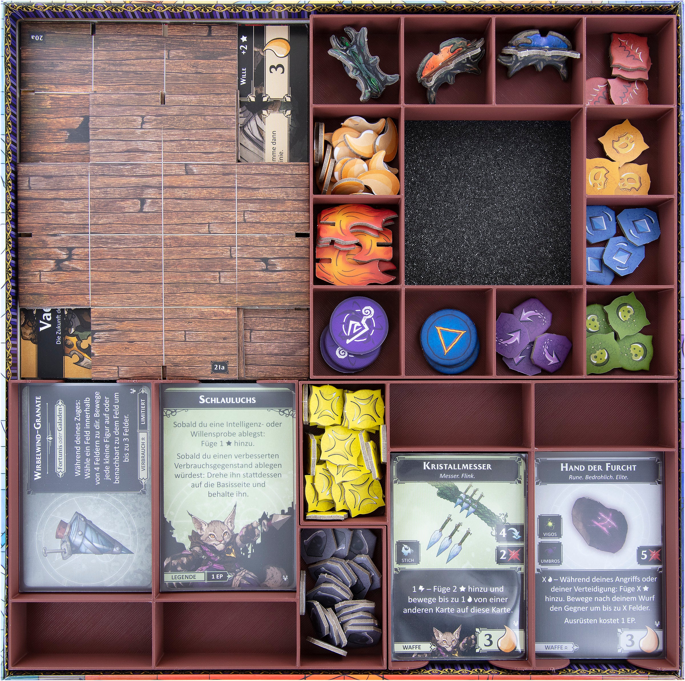 - 2 Token Trays aus Kunststoff mit jeweils 5 Fächern für Spielmaterial wie Karten (Fertigkeitskarten, Begleiterkarte, Legendenkarten, Waffenkarten, Rüstungskarten, Schmuckkarten und Verbrauchskarten) und Marker (Zustandsmarker, Umbramarker, Erschöpfungsmarker und Erkundungs-/Sichtungsmarker)