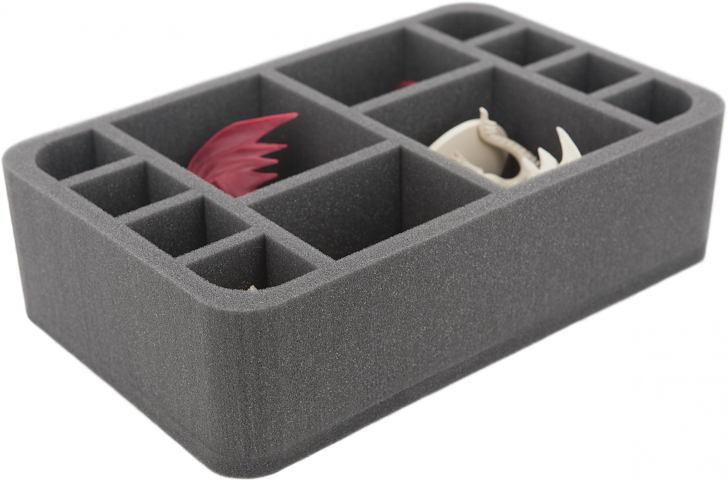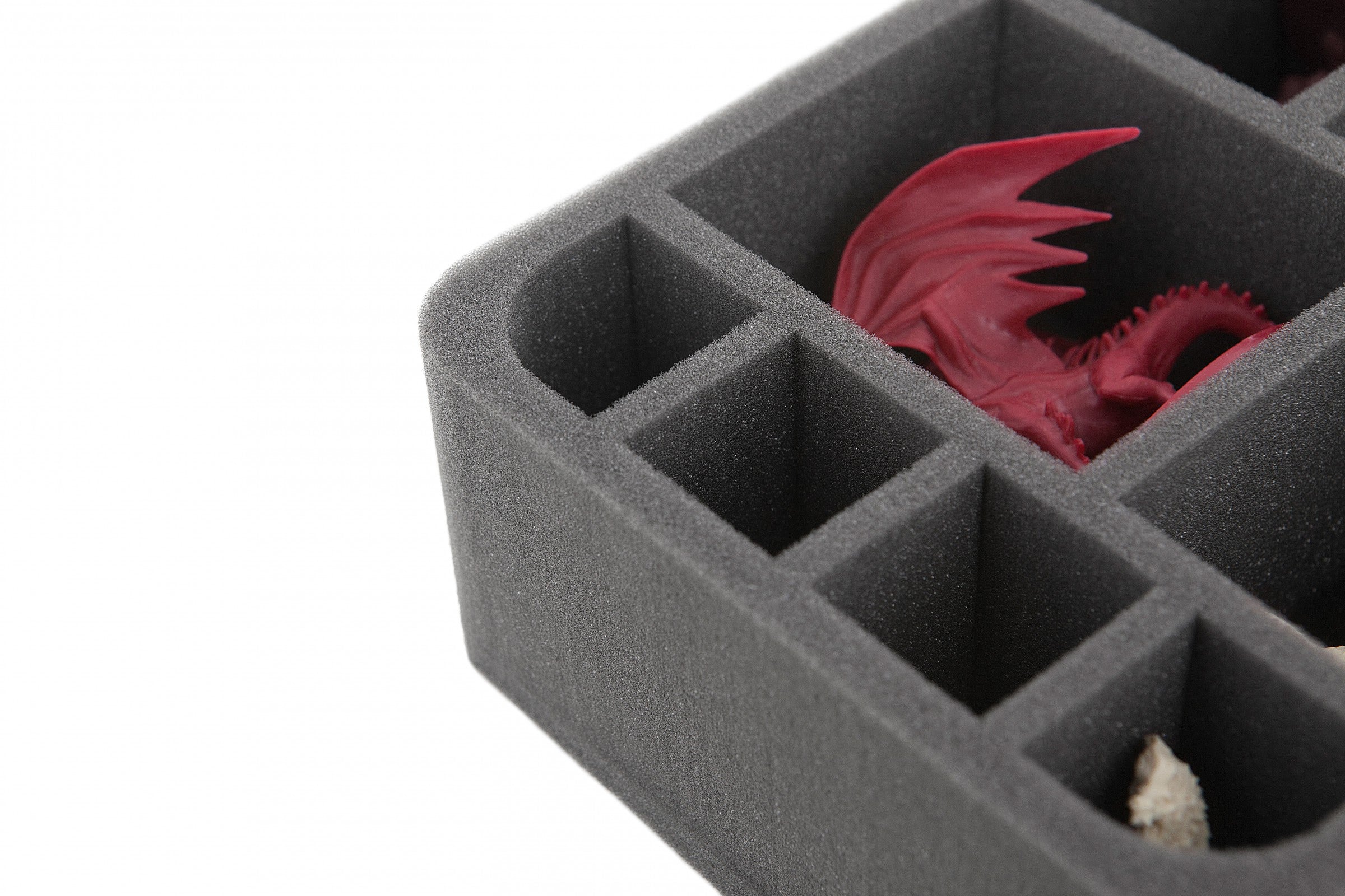 Sie besteht aus zwei Fächern mit den Maßen 80 x 90 x 65 mm Höhe, die als sichere Höhle für die Schattendrachen dienen. In zwei weiteren 80 x 55 x 65 mm großen Fächern finden die Merriods einen weichen Unterschlupf. Dadurch können die Figuren nicht herumrutschen oder aneinanderstoßen, was gerade bei bemalten Figuren zu ärgerlichen Farbschäden führt. Außerdem verfügt die Einlage über zusätzliche acht Fächer mit der Größe 36 x 33 x 65 mm für kleine Descent-Miniaturen. Die Eck-Fächer sind jeweils Feldherr-typisch abgerundet. Gut für Bogenschützen oder längliche Bases. Durch den 10 mm starken Boden erreicht die Einlage eine Gesamthöhe von 75 mm.