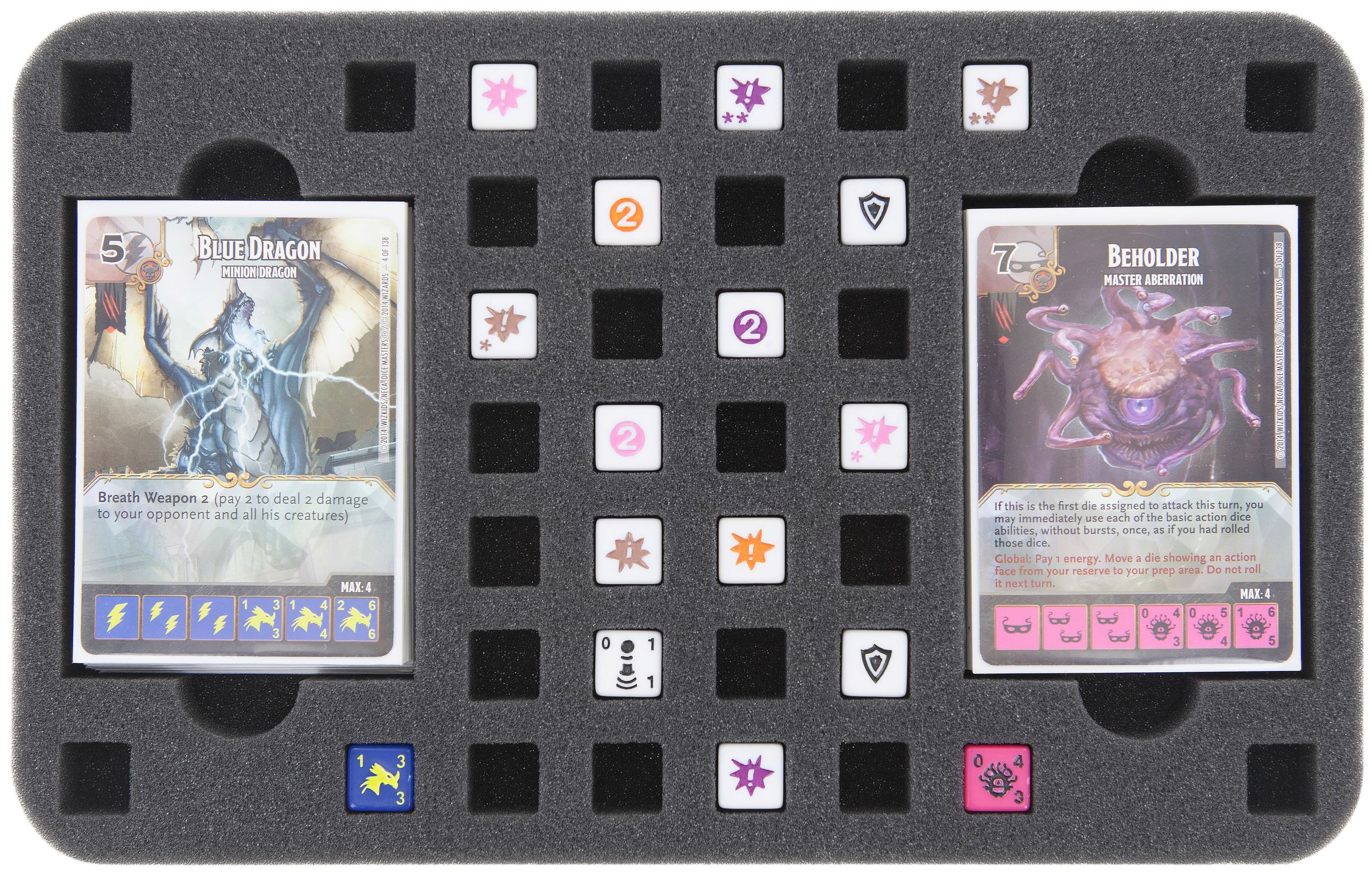 Die 6 Schaumstoffeinlagen bieten Platz für bis zu 216 Würfel mit 14 mm Kantenlänge und sind außerdem mit jeweils 2 Fächern für deine Karten (mit und ohne Sleeve) ausgestattet. Der Schaumstoffdeckel sorgt dafür, dass auch der Inhalt der obersten Einlage rundum verpackt ist. So hast du alles kompakt, übersichtlich und sicher verstaut.