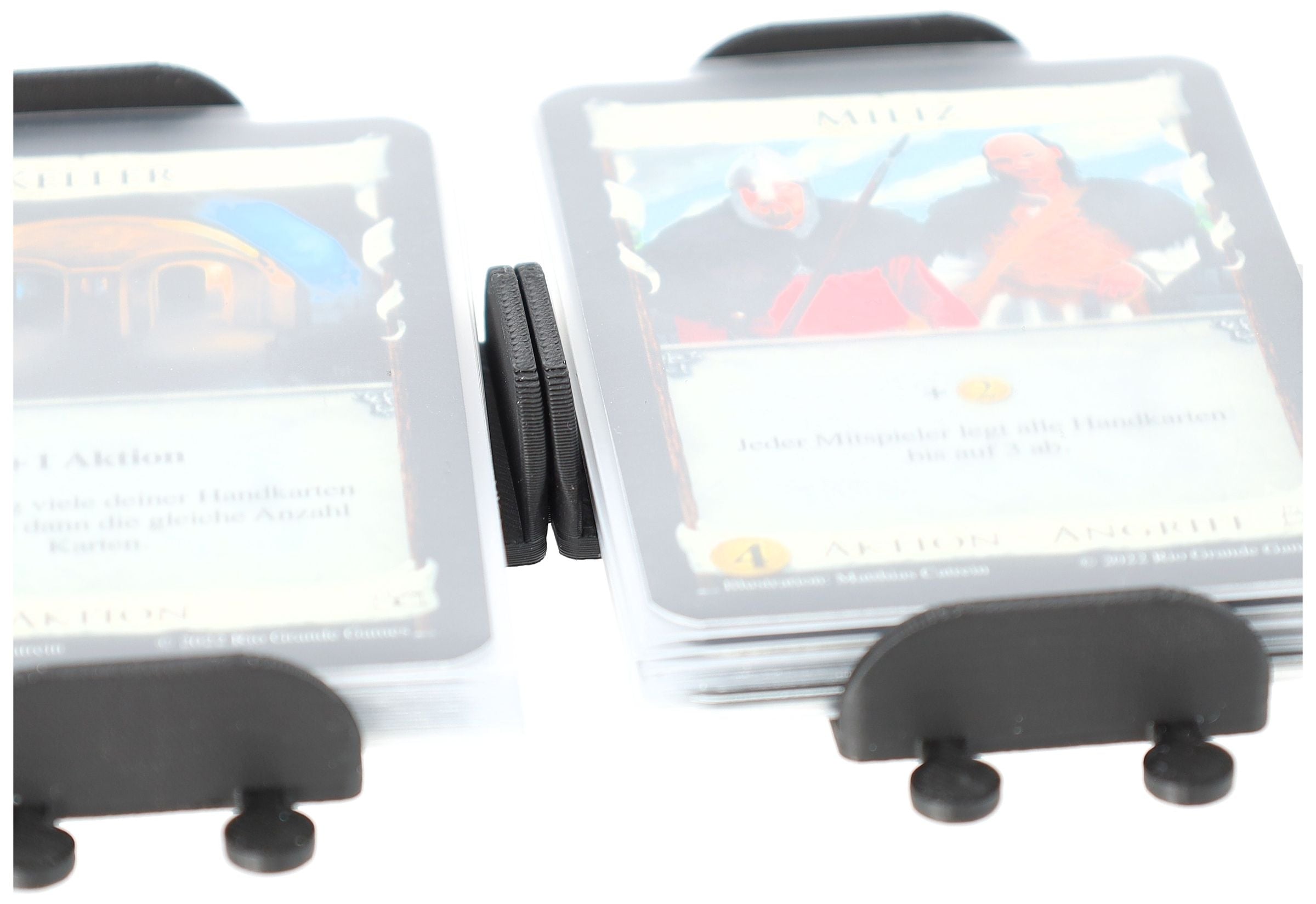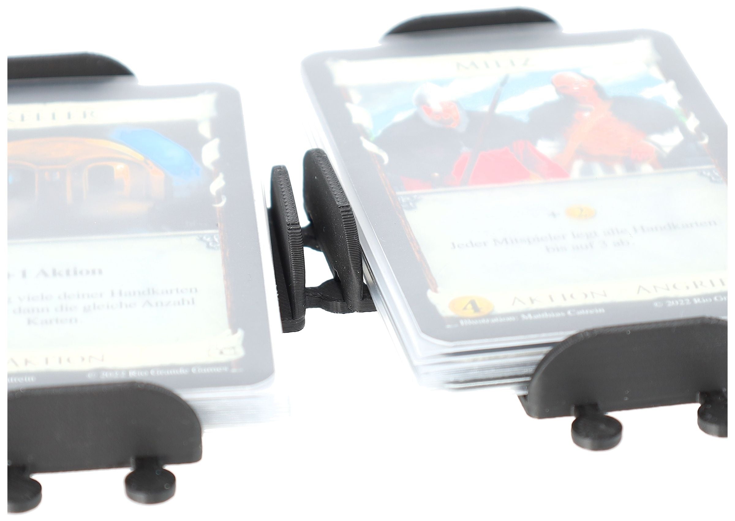 • Verbinde mehrere Kartenhalter durch ein Stecksystem miteinander. Dadurch erhöhst du die Stabilität der Stapel und verleihst dem Spielfeld eine bessere Struktur.