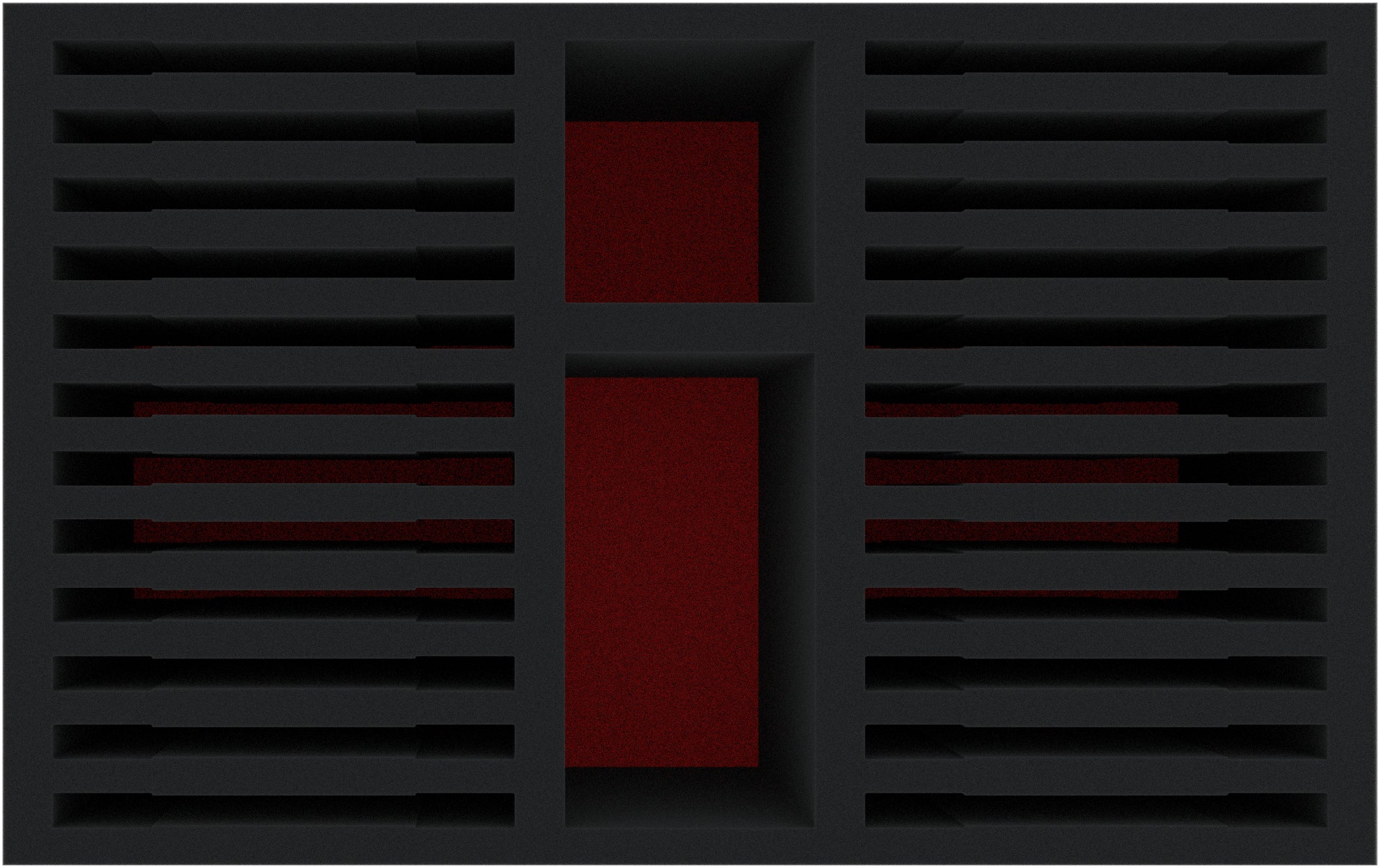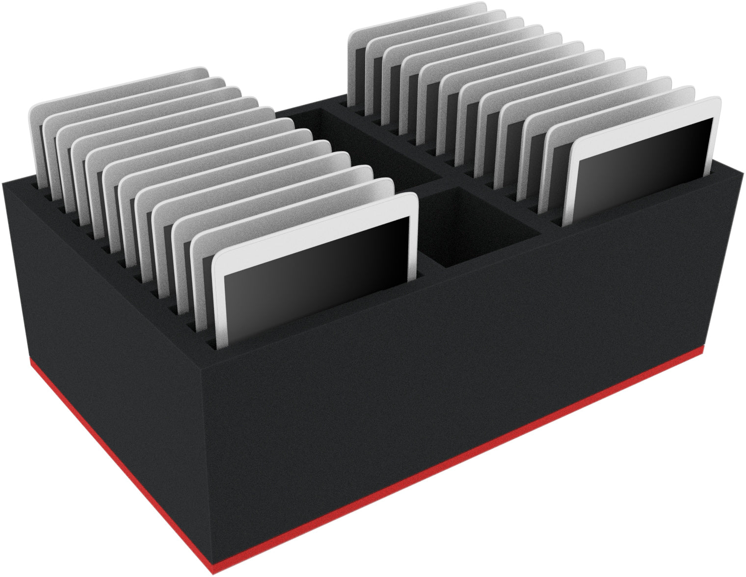 Die robuste Schaumstoffeinlage hat 24 Tablet Slots - für Tablets mit oder ohne Schutzhüllen. Zwei zusätzliche Fächer bieten Platz für Kabel, Netzteile und Zubehör.