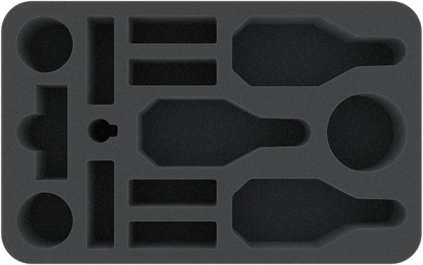 Die Feldherr Half Size (HS) Schaumstoffeinlage hat die Abmessungen: 275 mm x 172 mm x 50 mm Höhe. Die 50 mm Stärke der Matte ergibt sich aus der Nutzhöhe von 40 mm und dem angeklebten 10 mm Boden.