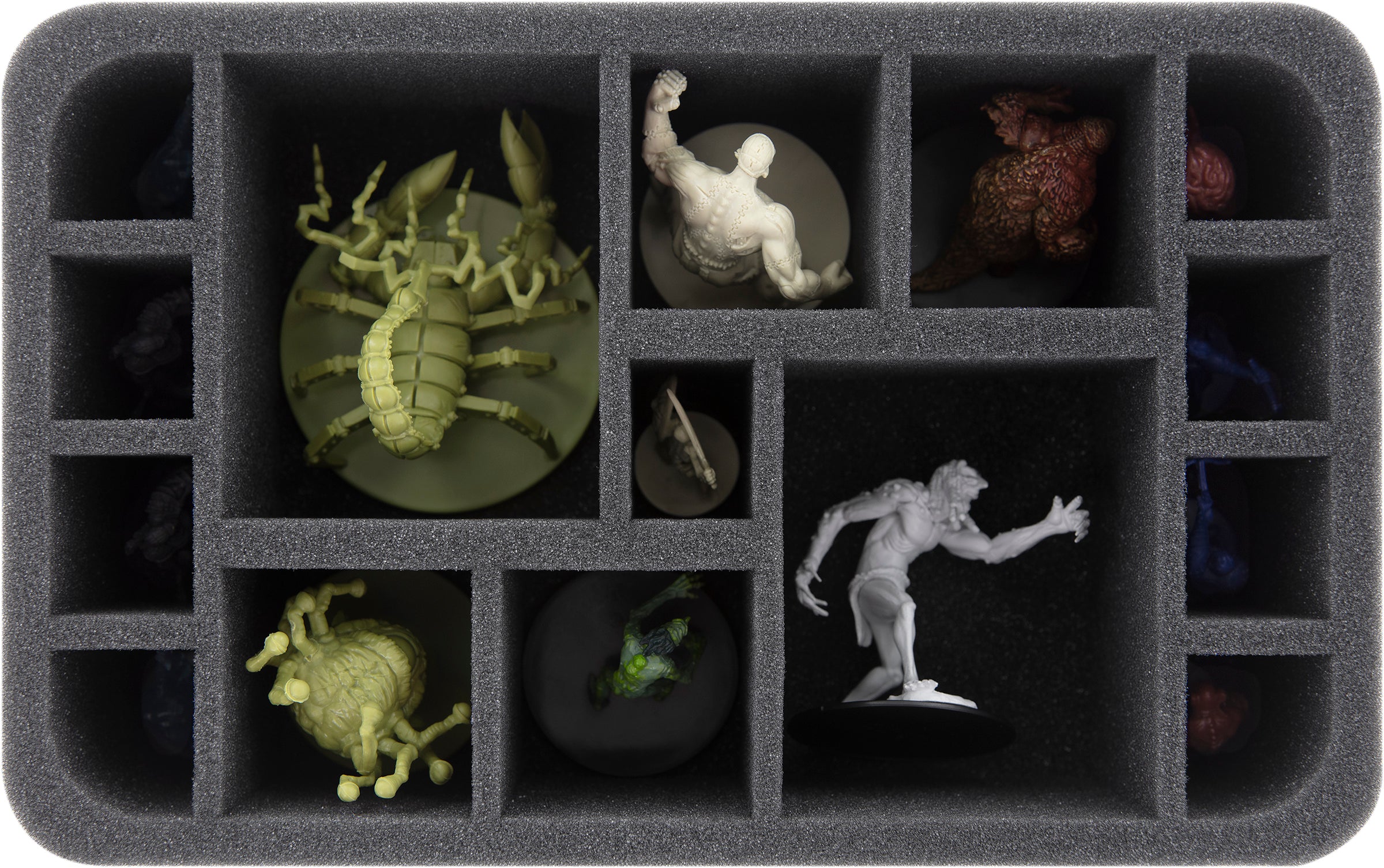 Mit dieser Feldherr Half-Size-Schaumstoffeinlage können bis zu 15 DnD-Miniaturen sicher untergebracht werden. Die unterschiedlich großen Fächer eignen sich hervorragend, um kleinere Helden und Monster übersichtlich und gut geschützt aufzubewahren.