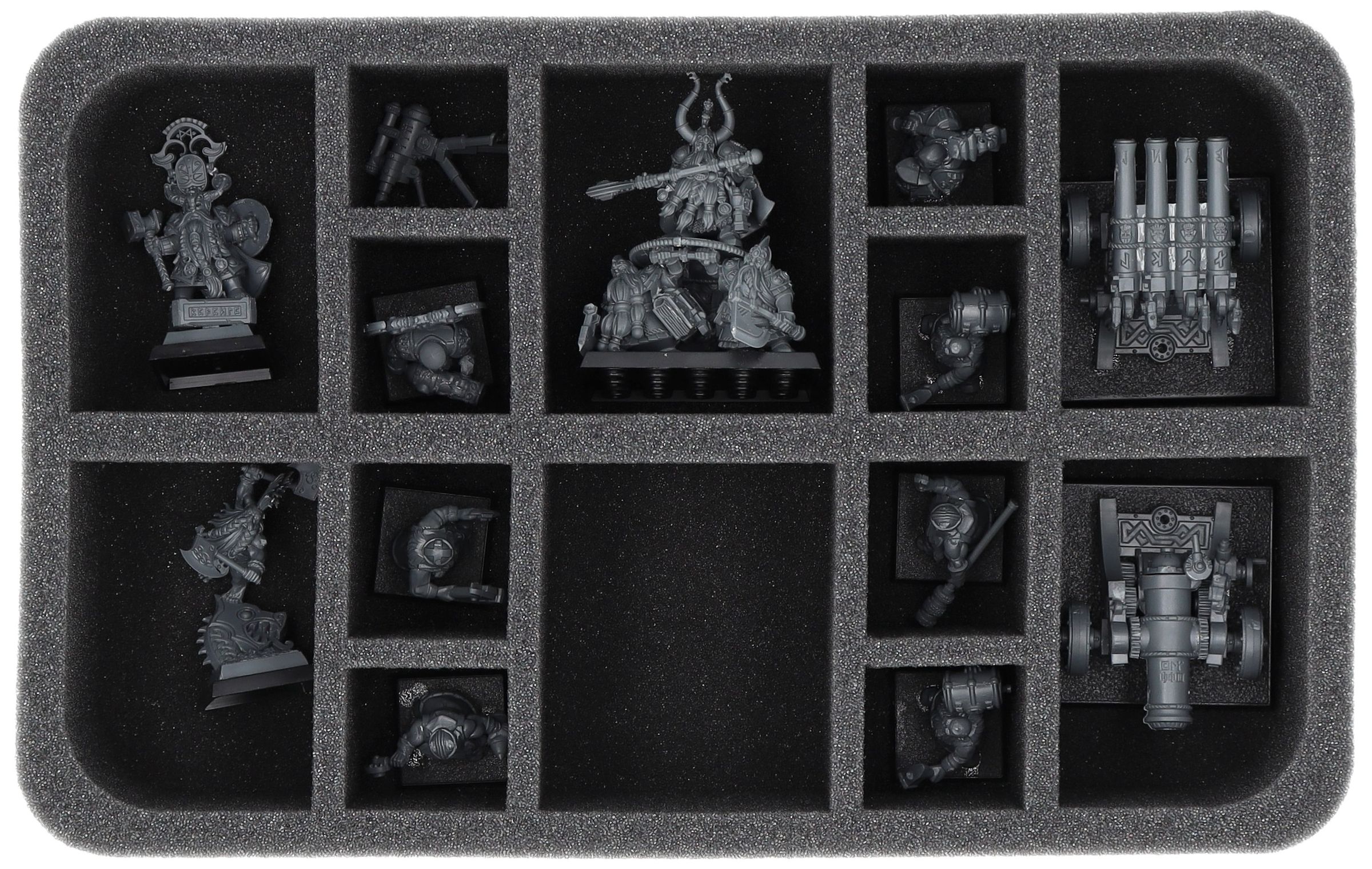 - 2 x HS065A014 – Schaumstoffeinlagen mit jeweils 14 Fächern für z. B. Eidstein, Legendärer Slayer der Zwerge, Zwergenfürsten mit Schildträgern, Zwergenkanone und Orgelkanone