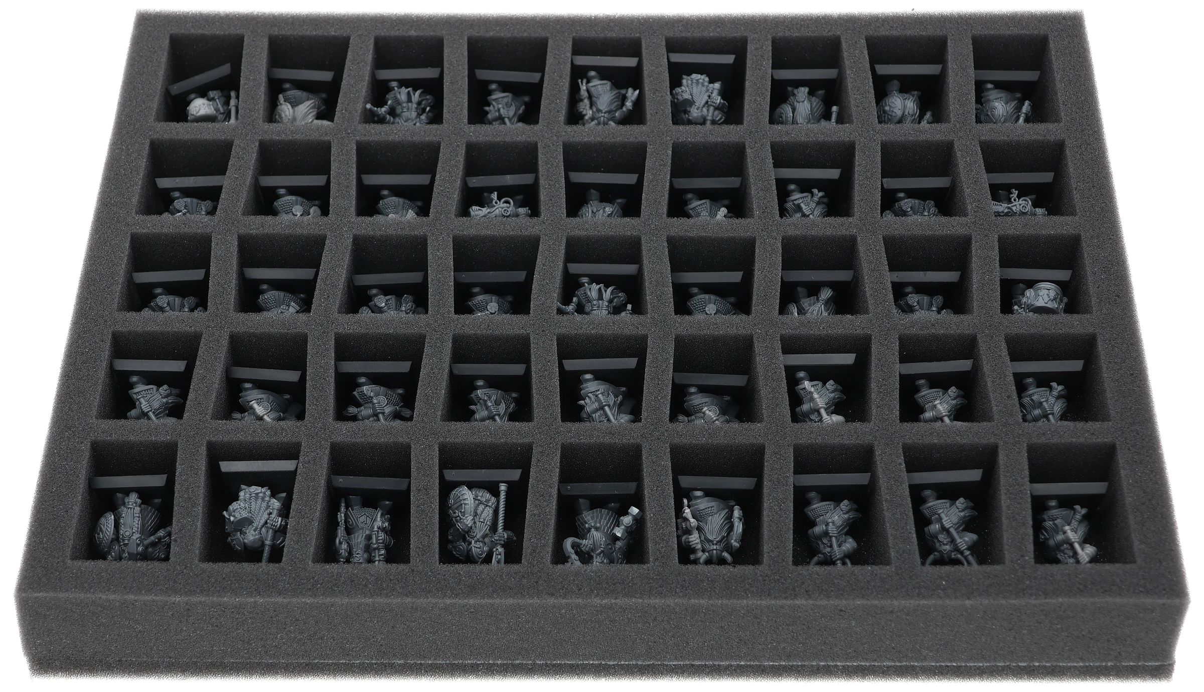 Auf dieser Feldherr Schaumstoffeinlage hast du Platz für bis zu 45 Miniaturen deiner Armee. Das Insert eignet sich zum Beispiel besonders gut zum Aufbewahren der Krieger der Zwerge, Armbrustschützen der Zwerge, Eisenbrecher der Zwerge, Hammerträger der Zwerge, Slayer der Zwerge und Modellen mit ähnlichen Abmessungen.