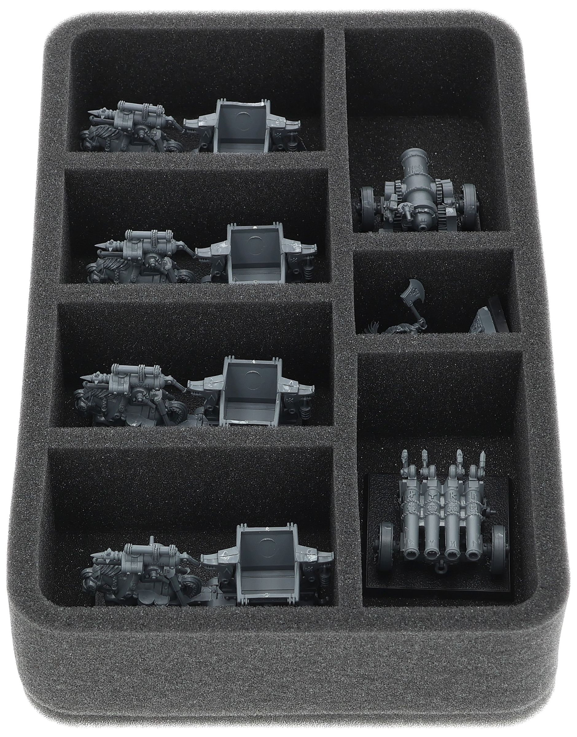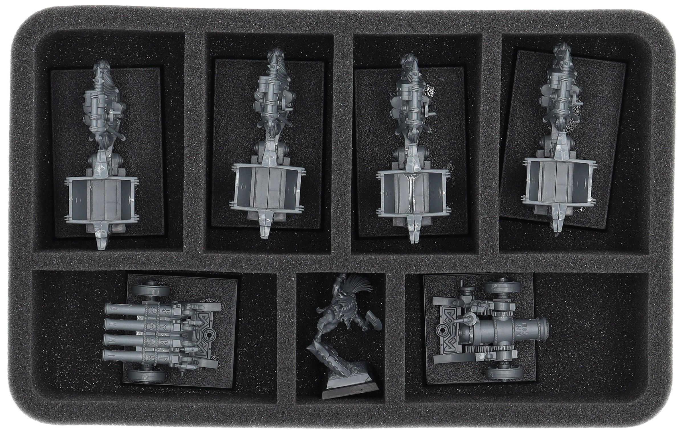 Auf dieser Feldherr Schaumstoffeinlage hast du Platz für bis zu 7 Miniaturen deiner Armee. Das Insert eignet sich zum Beispiel besonders gut zum Aufbewahren der Zwergenbergwerker und Modellen mit ähnlichen Abmessungen.