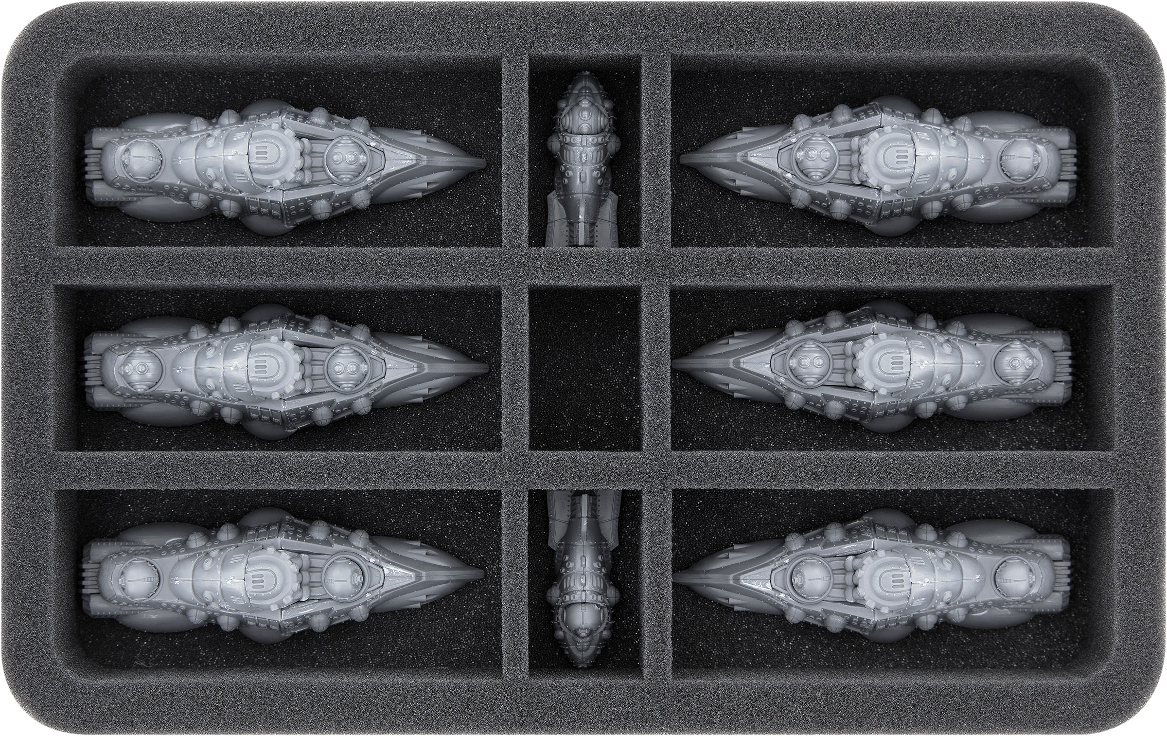 Auf dieser Feldherr Schaumstoffeinlage hast du Platz für 9 Miniaturen deiner Flotte. Das Insert eignet sich zum Beispiel besonders gut zum Aufbewahren von schweren Kreuzern der Klasse Copernicus, Fregatten der Klasse Merian sowie Modellen mit ähnlichen Abmessungen.