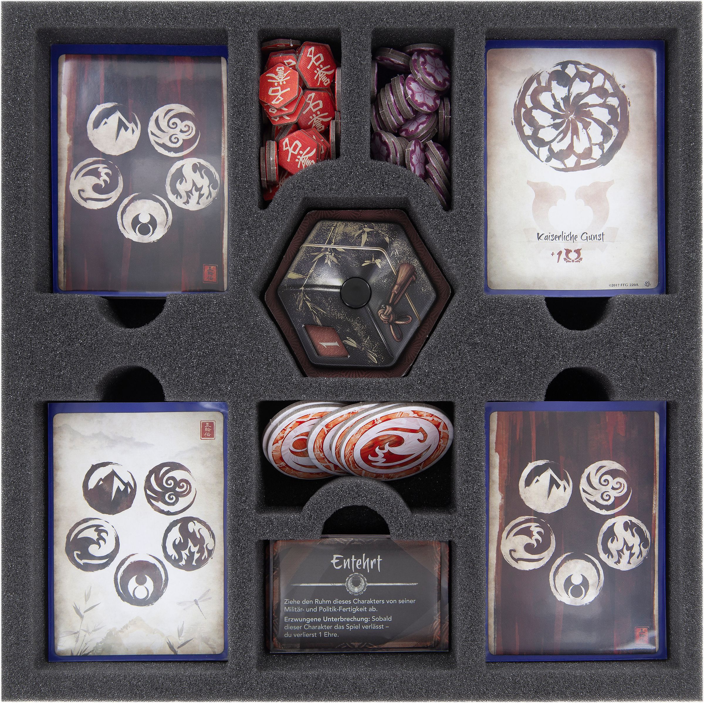 Mit unserem Schaumstoff-Set für „Legend of the Five Rings“ sind deine Karten und die Token ordentlich und sicher in der Grundspiel-Box verstaut.
