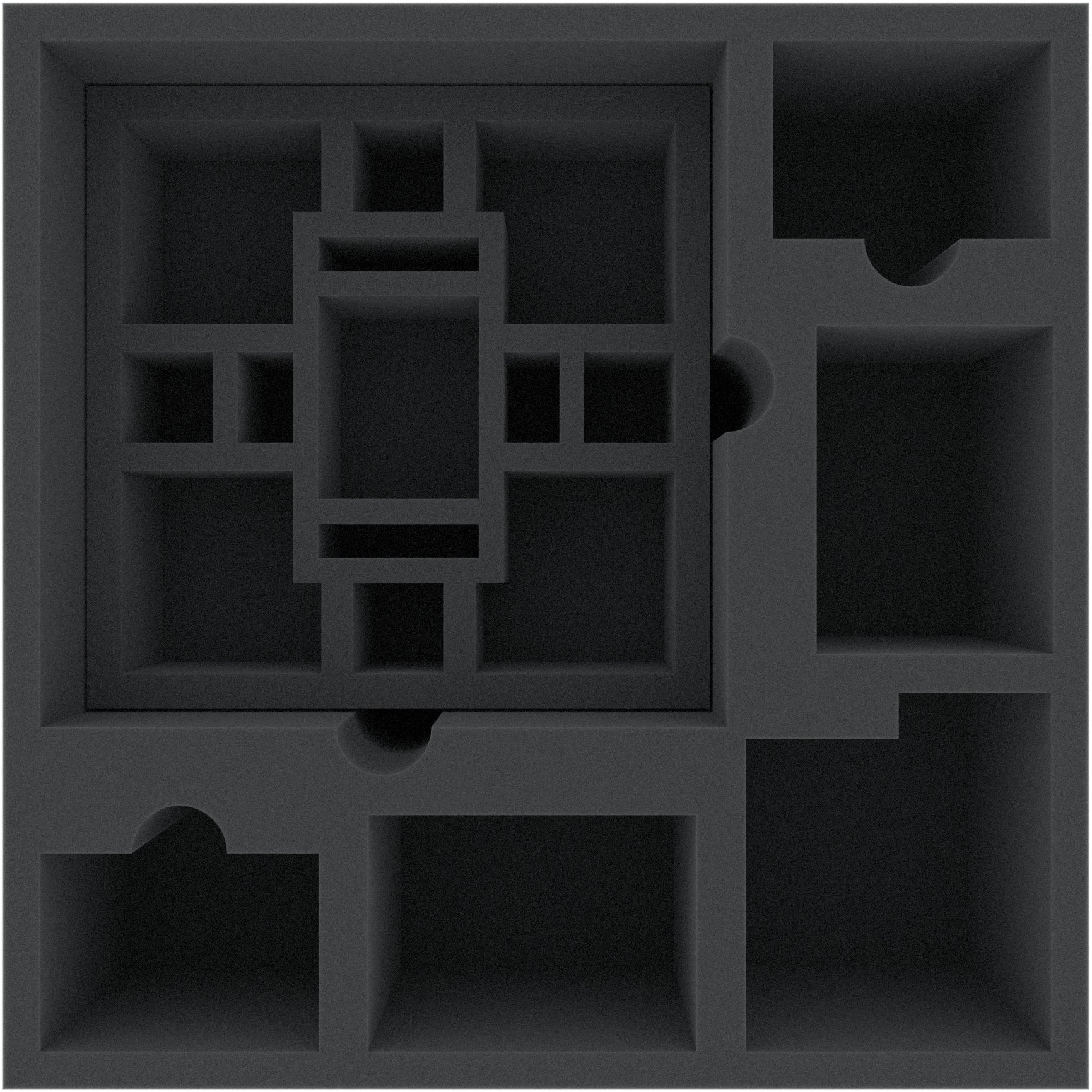 Eine große Schaumstoffeinlage passt genau in den originalen Spielkarton. Diese ist unterteilt in fünf Fächer für Miniaturen und Spielzubehör, sowie ein großes Fach für den Schaumstoffeinsatz.