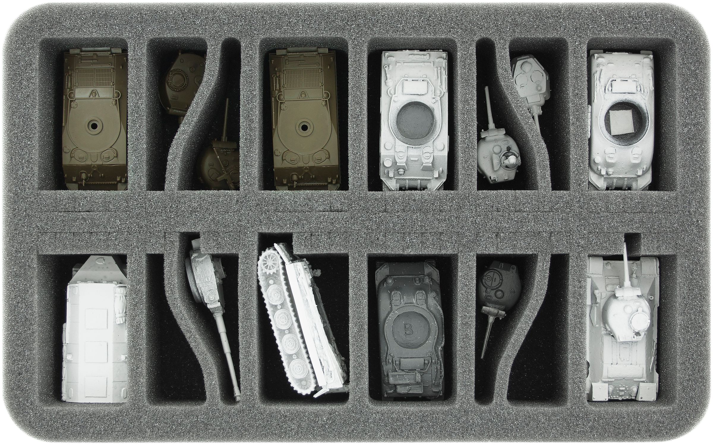 Diese Feldherr Schaumstoffeinlage verfügt über 16 Fächer zum sicheren und ordentlichen Aufbewahren von 8 "Flames of War" Panzern. In den 8 großen Fächern finden die Panzer Platz, die 8 kleineren Fächer mit den geschwungenen Seiten sind ideal für die Panzertürme geeignet.