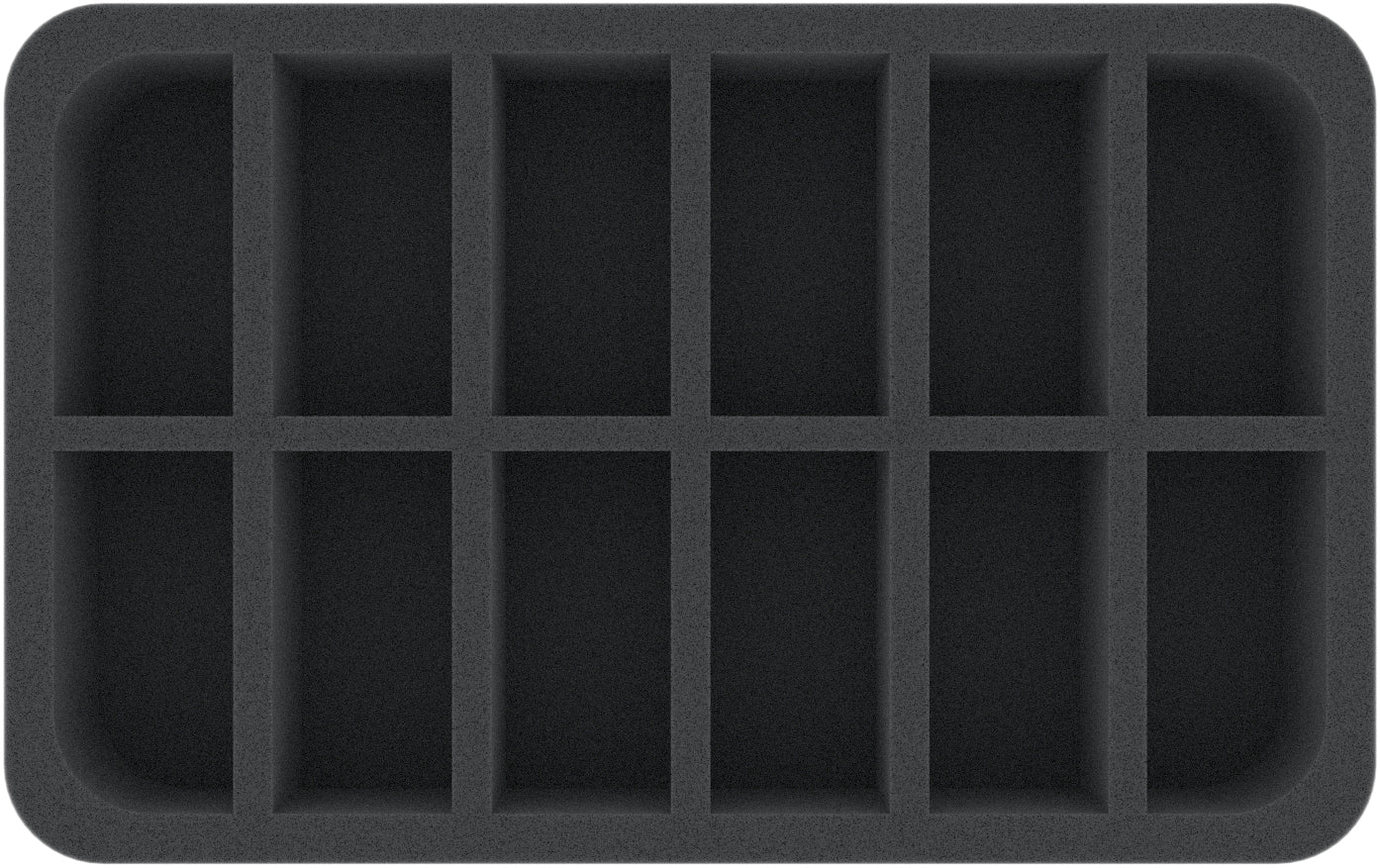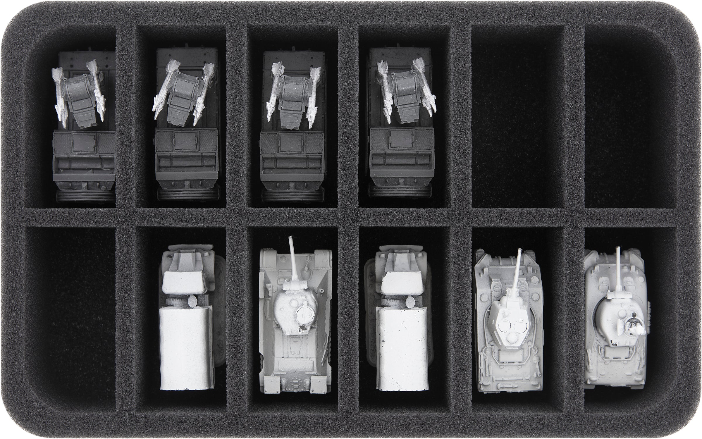 Die 12 unterschiedlich großen Fächer auf dieser Half-Size-Schaumstoffeinlage eignen sich besonders gut zur ordentlichen Aufbewahrung von unterschiedlichen Fahrzeug-Modellen für Flames of War und Team Yankee.