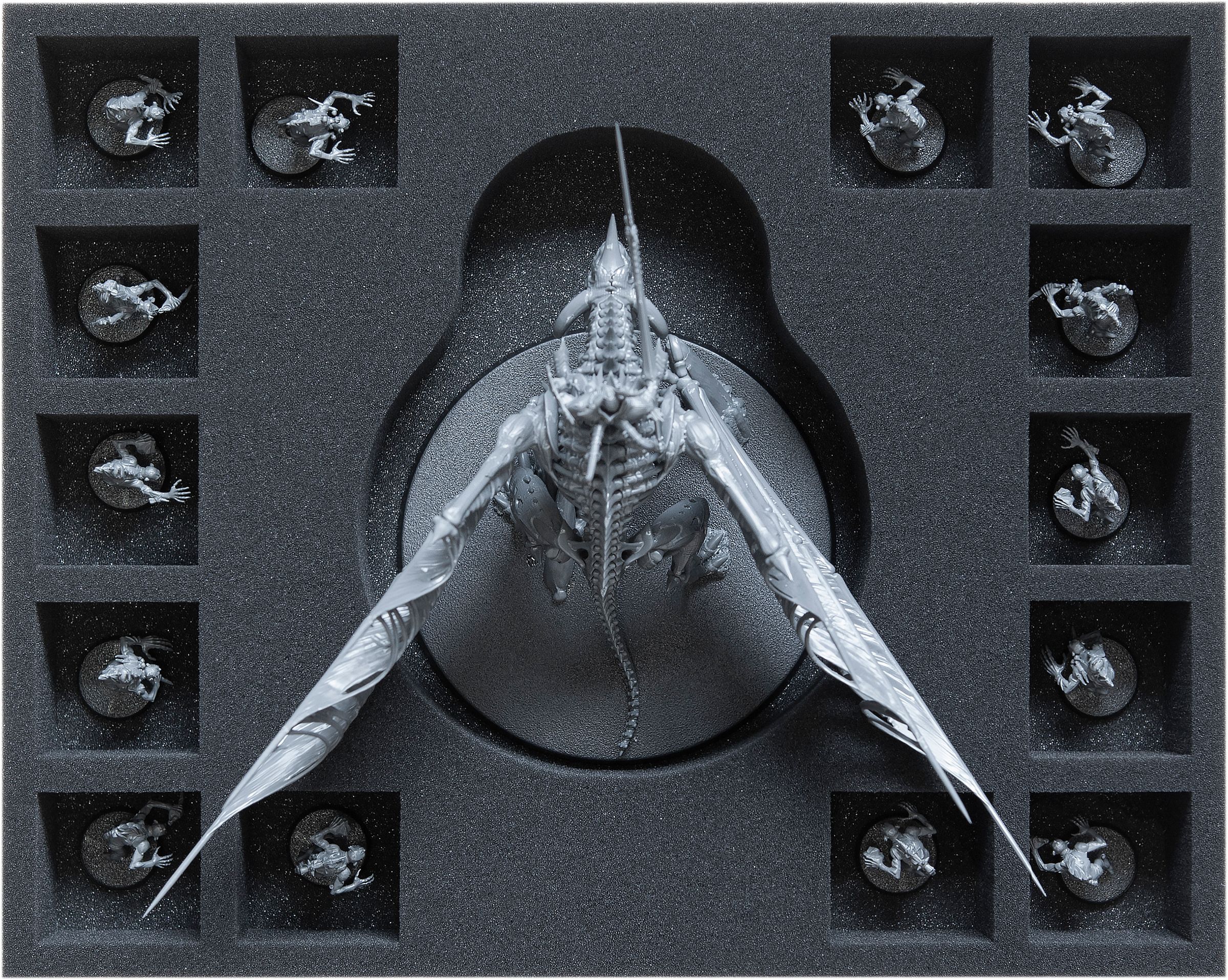 Damit auch der restliche Teil der Figur sicher in Schaumstoff gepackt ist, kommt die zweite Einlage obenauf. Diese ist mit einer miniaturengenau zugeschnittenen Aussparung versehen. Dadurch sind die empfindlichen Flügel und alle anderen filigranen Details optimal vor Beschädigungen geschützt. Wenn die Miniatur nach Stunden intensiver Arbeit schließlich bemalt ist, kannst du dich (zumindest bis zur nächsten Schlacht) entspannen, denn die Farben sind hier ebenfalls sicher vor Abrieb und Kratzern.