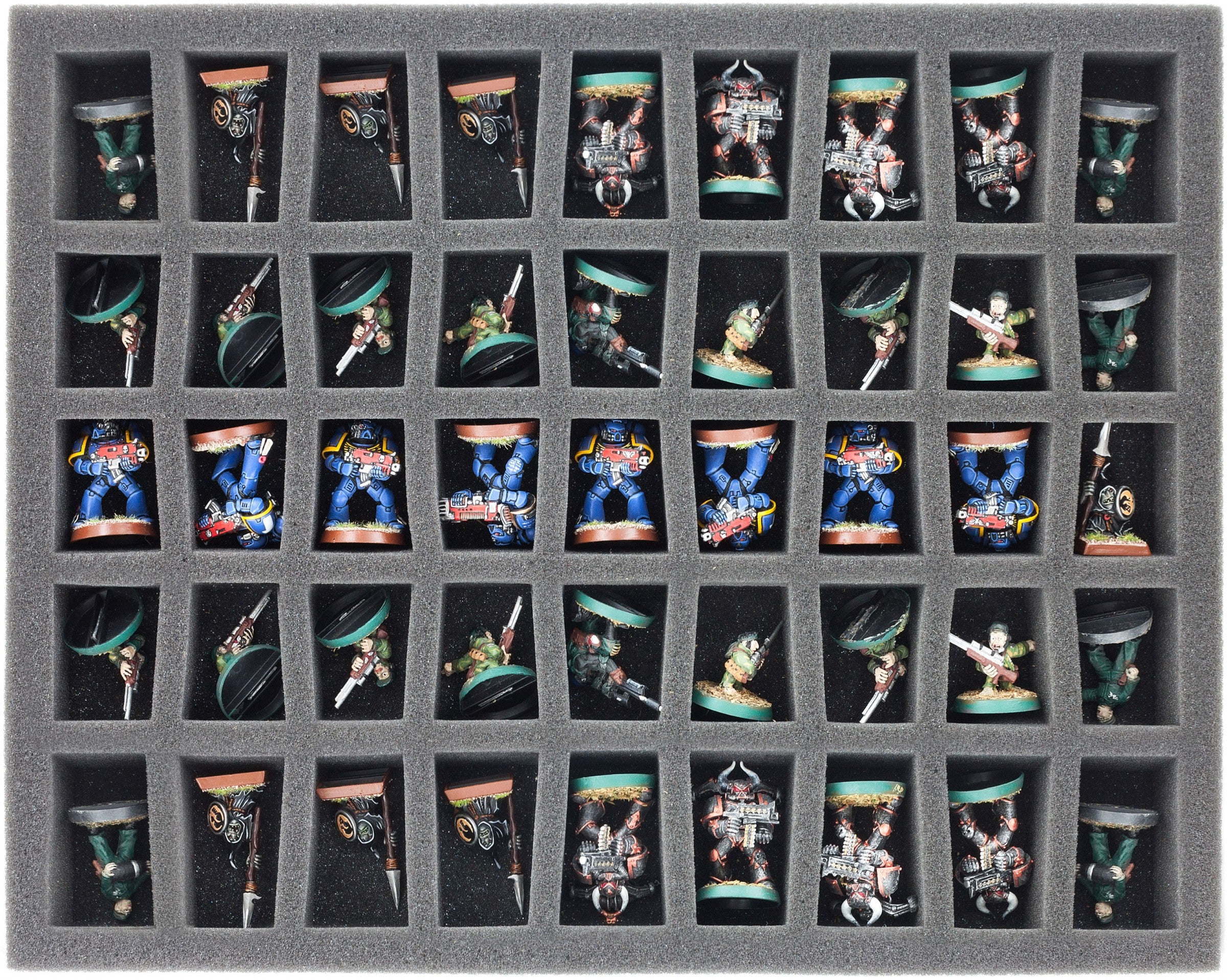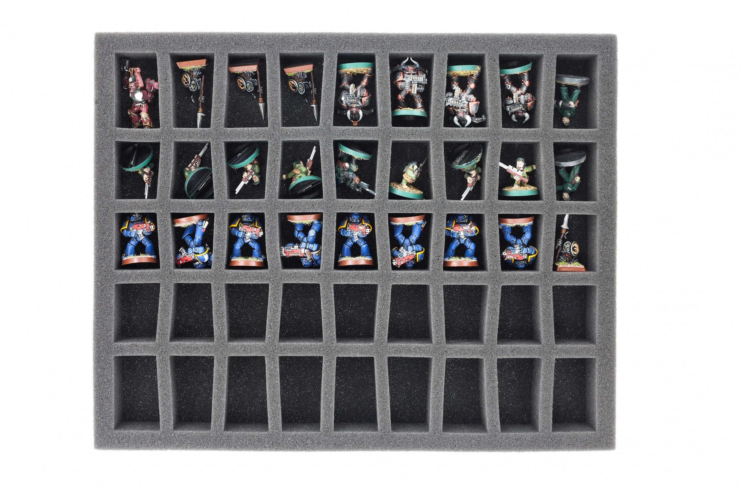 Schaumstoffeinlagen mit Fächern im C-slot Design! Die vorgestanzten Fächer haben eine konische Grundfläche. Ideal für Miniaturen im 28 mm Maßstab. Die Grundfläche der Schaumstoffmatten mit 45 Fächern ist die Gleiche wie die der Matten mit 36 rechteckigen Fächern (345 mm x 275 mm). Die Fächer haben wir platzsparender angeordnet und die Abstände zwischen den Fächern optimiert. Auf einer Matte sind 5 Reihen á 9 Fächer vorgestanzt.