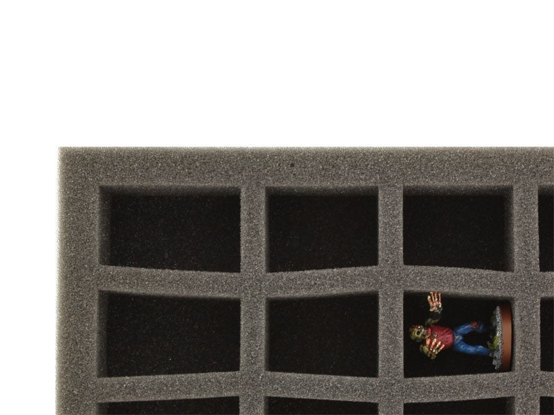 Schaumstoffeinlagen mit Fächern im C-slot Design! Die vorgestanzten Fächer haben eine konische Grundfläche. Ideal für Miniaturen im 28 mm Maßstab. Die Grundfläche der Schaumstoffmatten mit 45 Fächern ist die Gleiche wie die der Matten mit 36 rechteckigen Fächern (345 mm x 275 mm). Die Fächer haben wir platzsparender angeordnet und die Abstände zwischen den Fächern optimiert. Auf einer Matte sind 5 Reihen á 9 Fächer vorgestanzt.