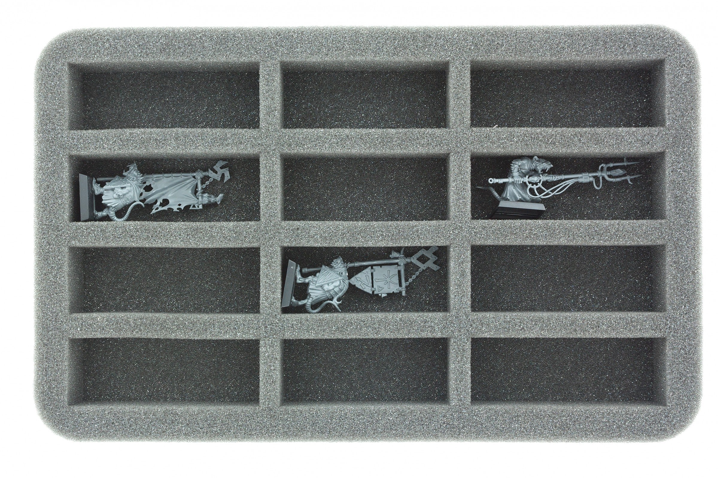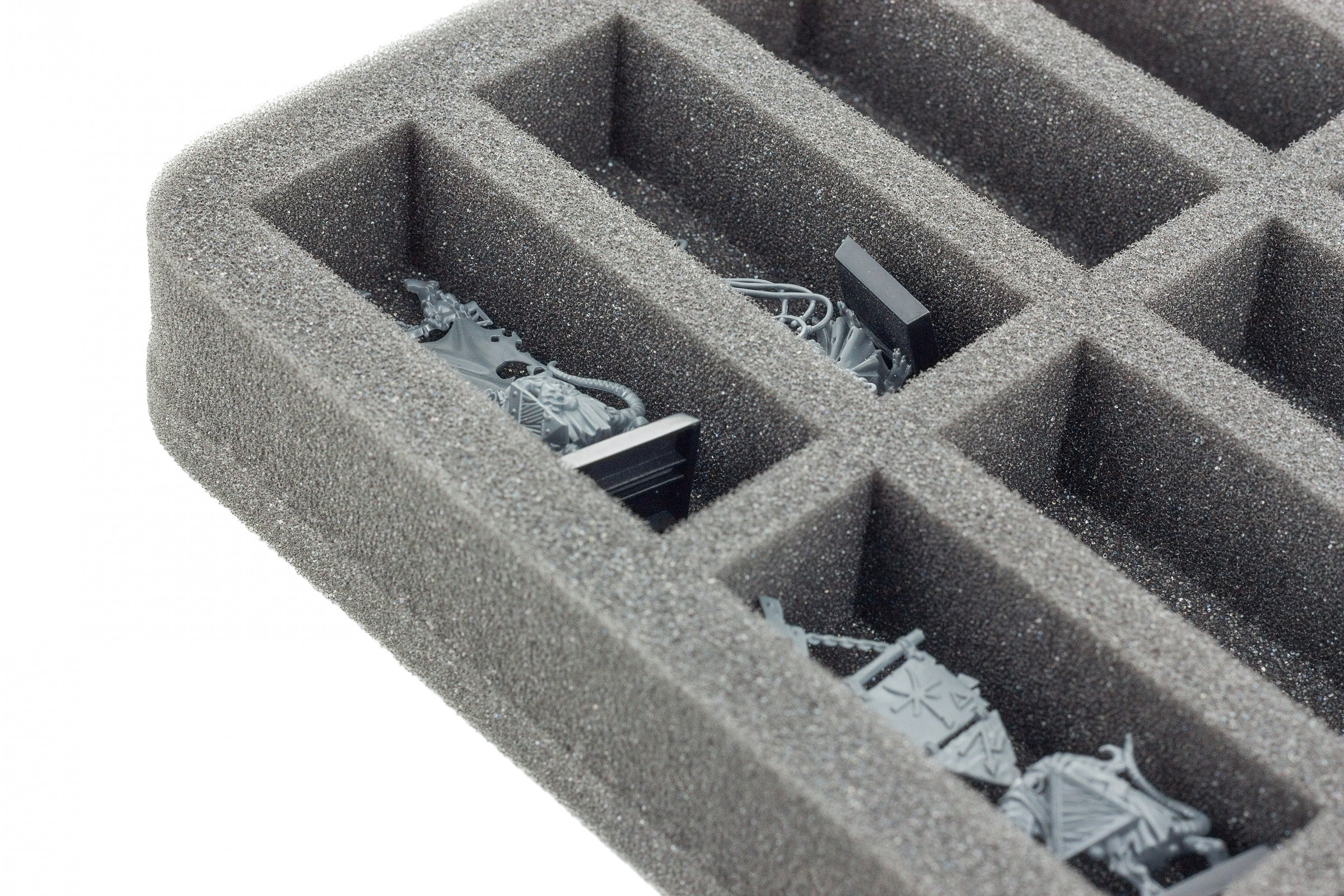 Diese Half-Size-Schaumstoffeinlage ist unterteilt in 12 längliche Fächer unterschiedlicher Größe. Sie ist somit hervorragend geeignet für Schwertträger, Musketenschützen oder Speerträger aus verschiedenen Brettspielen und Tabletopsystemen. Auch Spielmaterial, wie Würfel und Token, lasen sich hier übersichtlich ordnen.