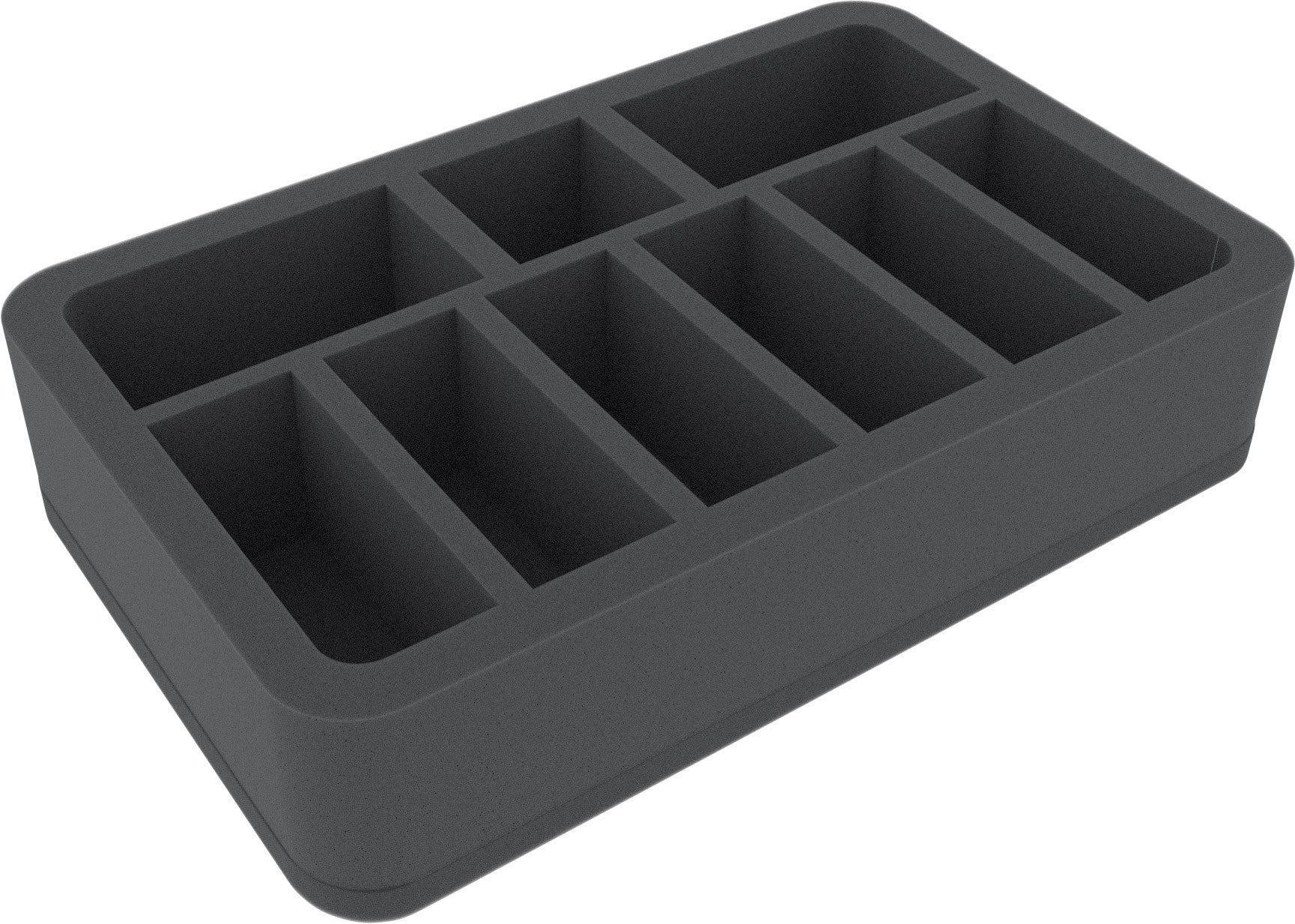 Diese Half-Size-Schaumstoffeinlage ist unterteilt in 9 unterschiedlich große Fächer. Sie eignet sich besonders gut für größere Tabletop- und Brettspiel-Miniaturen.