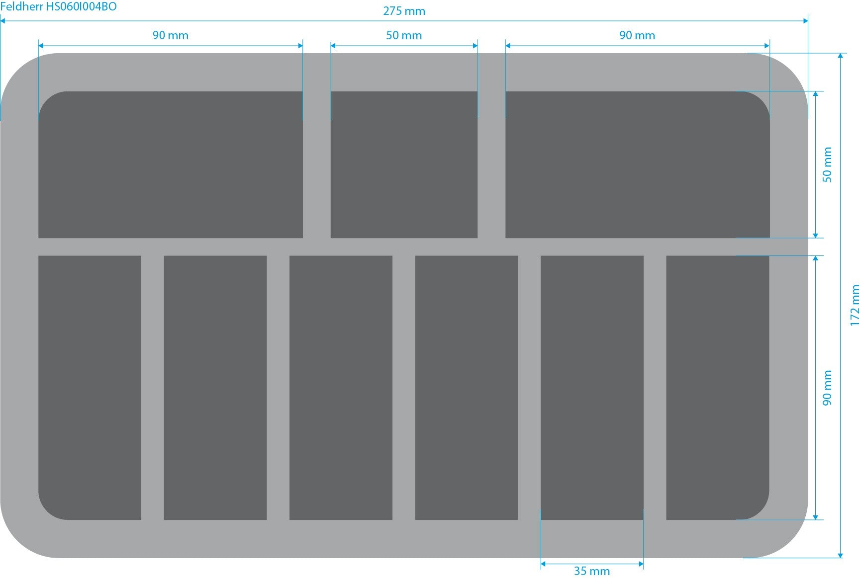 - 6 Fächer: 90 mm lang x 35 mm breit x 50 mm tief