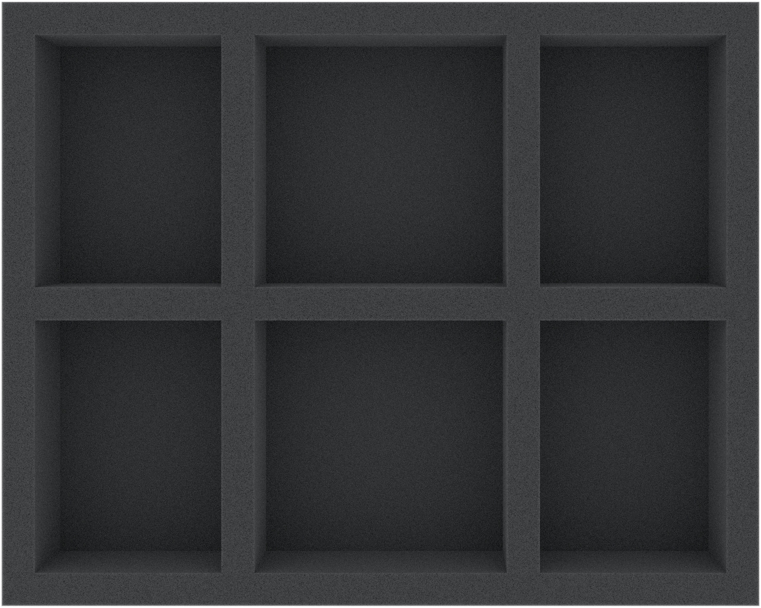Diese Full-Size-Schaumstoffeinlage teilt sich in 6 Fächer in 2 unterschiedlichen Größen. Die vier rechteckigen Fächer außen und 2 quadratischen Fächer in der Mitte eignen sich besonders gut für größere und sperrige Tabletop- und Brettspiel-Miniaturen, wie z. B. Fahrzeuge und Monster.
