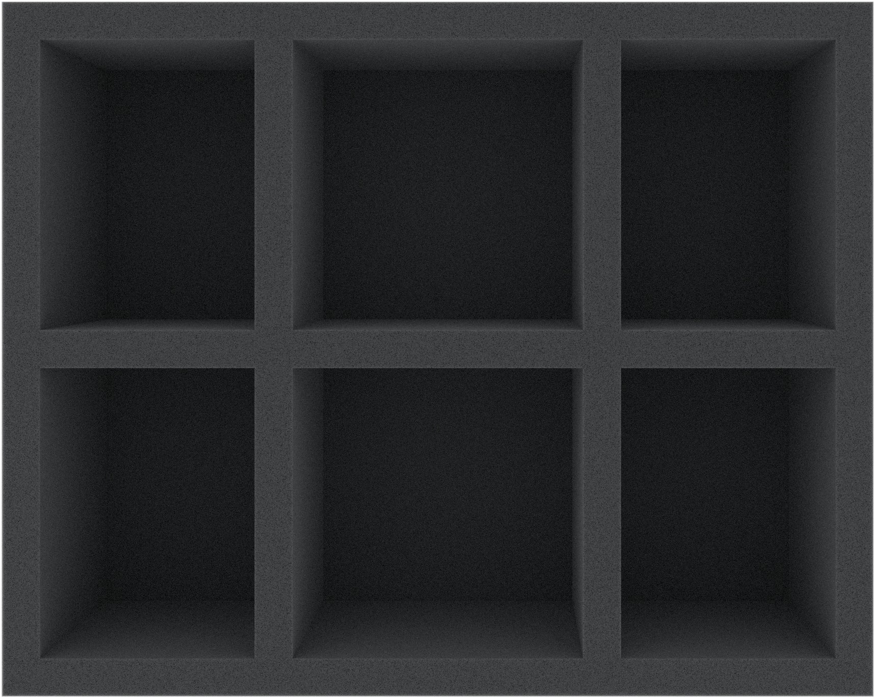 Diese Full-Size-Schaumstoffeinlage teilt sich in 6 Fächer in 2 unterschiedlichen Größen. Die vier rechteckigen Fächer außen und 2 quadratischen Fächer in der Mitte eignen sich besonders gut für größere und sperrige Tabletop- und Brettspiel-Miniaturen, wie Fahrzeuge oder Monster.
