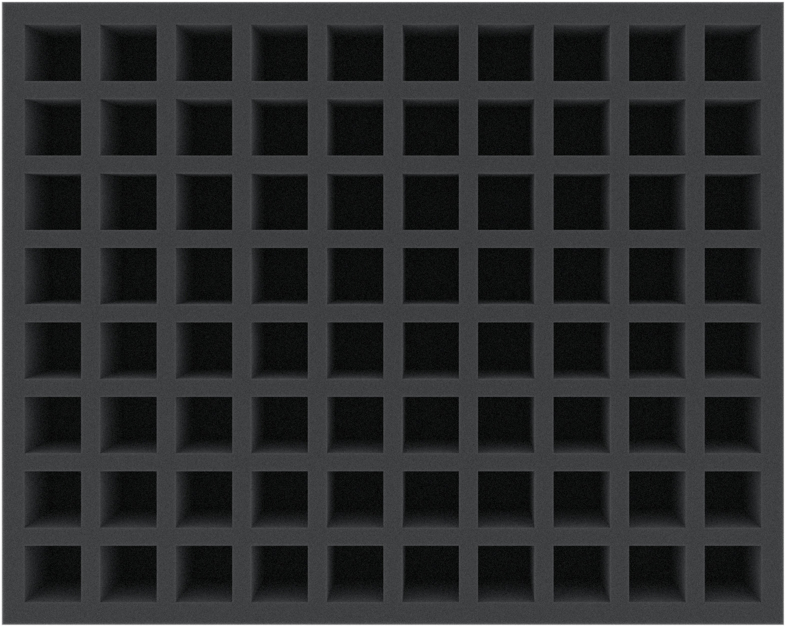 Diese Full-Size-Schaumstoffeinlage ist unterteilt in 80 Fächer. Die gleich großen Fächer eignen sich hervorragend zum sicheren Aufbewahren von kleinen Miniaturen für verschiedene Brettspiele und Tabletop-Systeme.