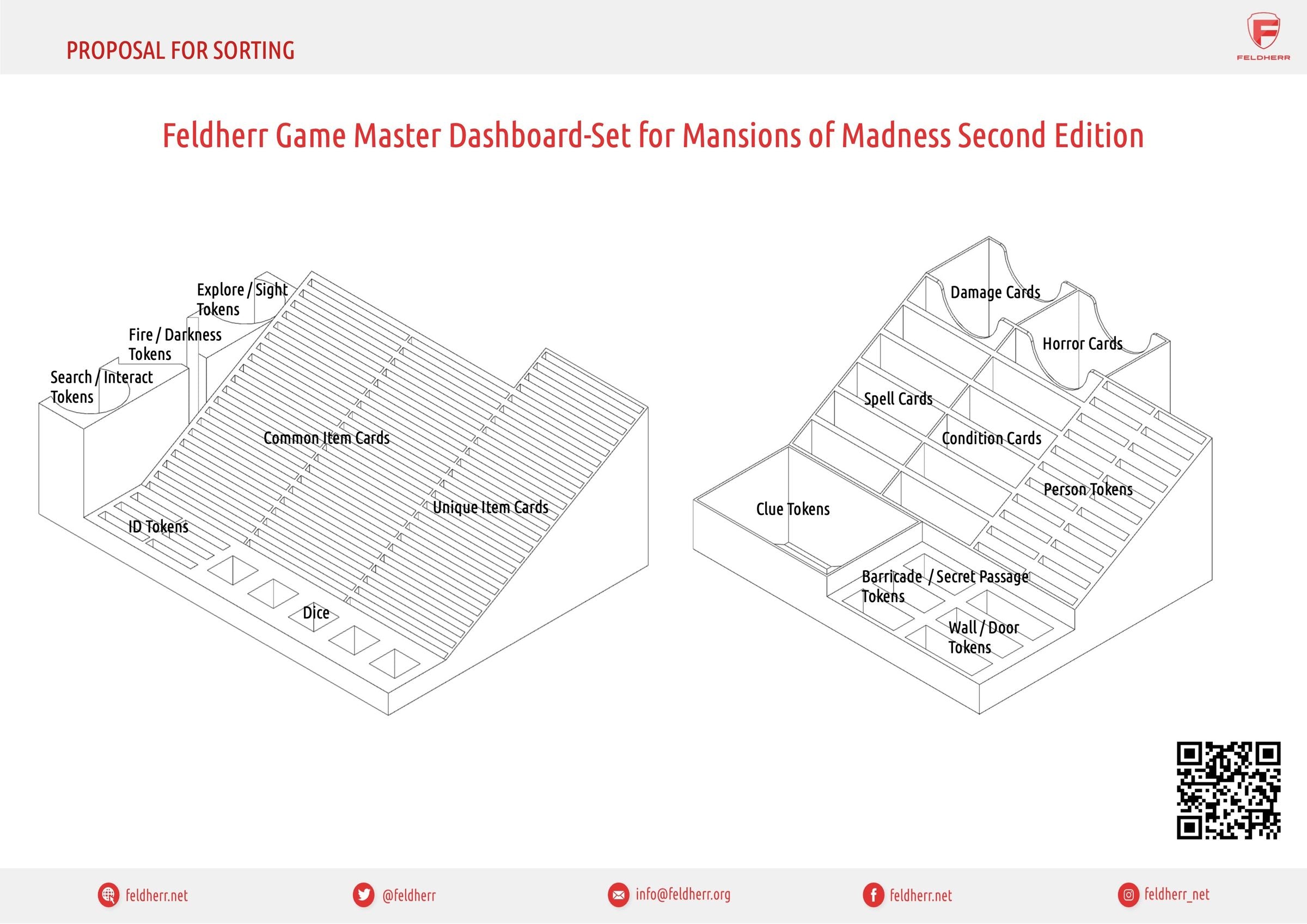 - Tray 1 bietet 14 Fächer für Würfel, ID-Marker, Durchsuchungs-/Interaktionsmarker, Feuer/Dunkelheitsmarker, Erkundungs-/Sichtungsmarker, sowie 64 Kartenschlitze für Karten von einfachen und besonderen Gegenständen.