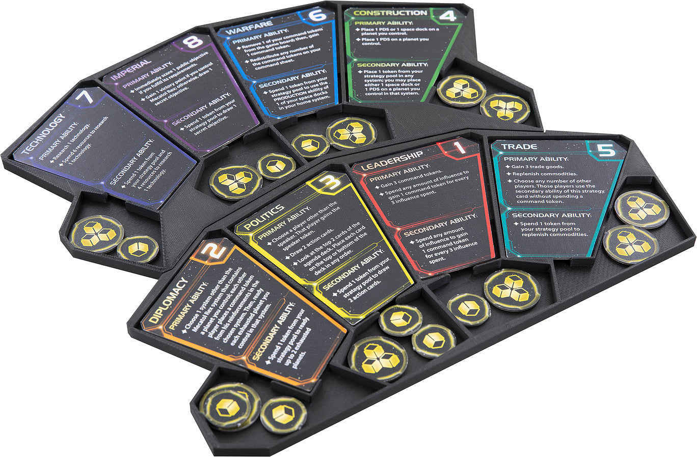 • Die Spielertafel aus Kunststoff bietet Platz für alle Strategiekarten und die dazugehörigen Handelswaren- und Massenproduktmarker für die 4. Edition von Twilight Imperium.