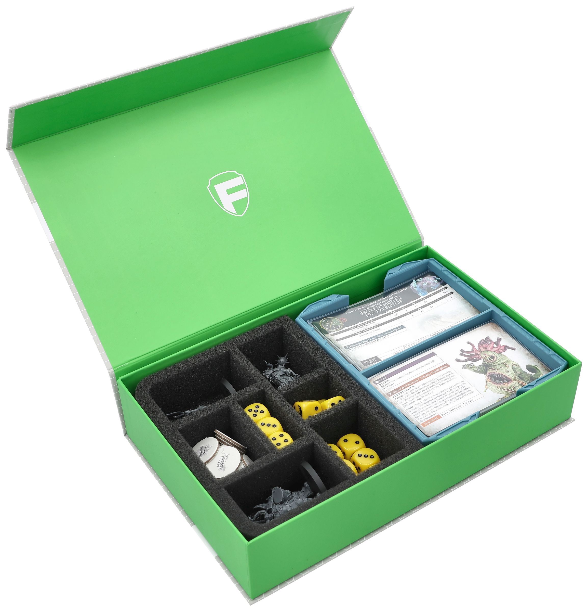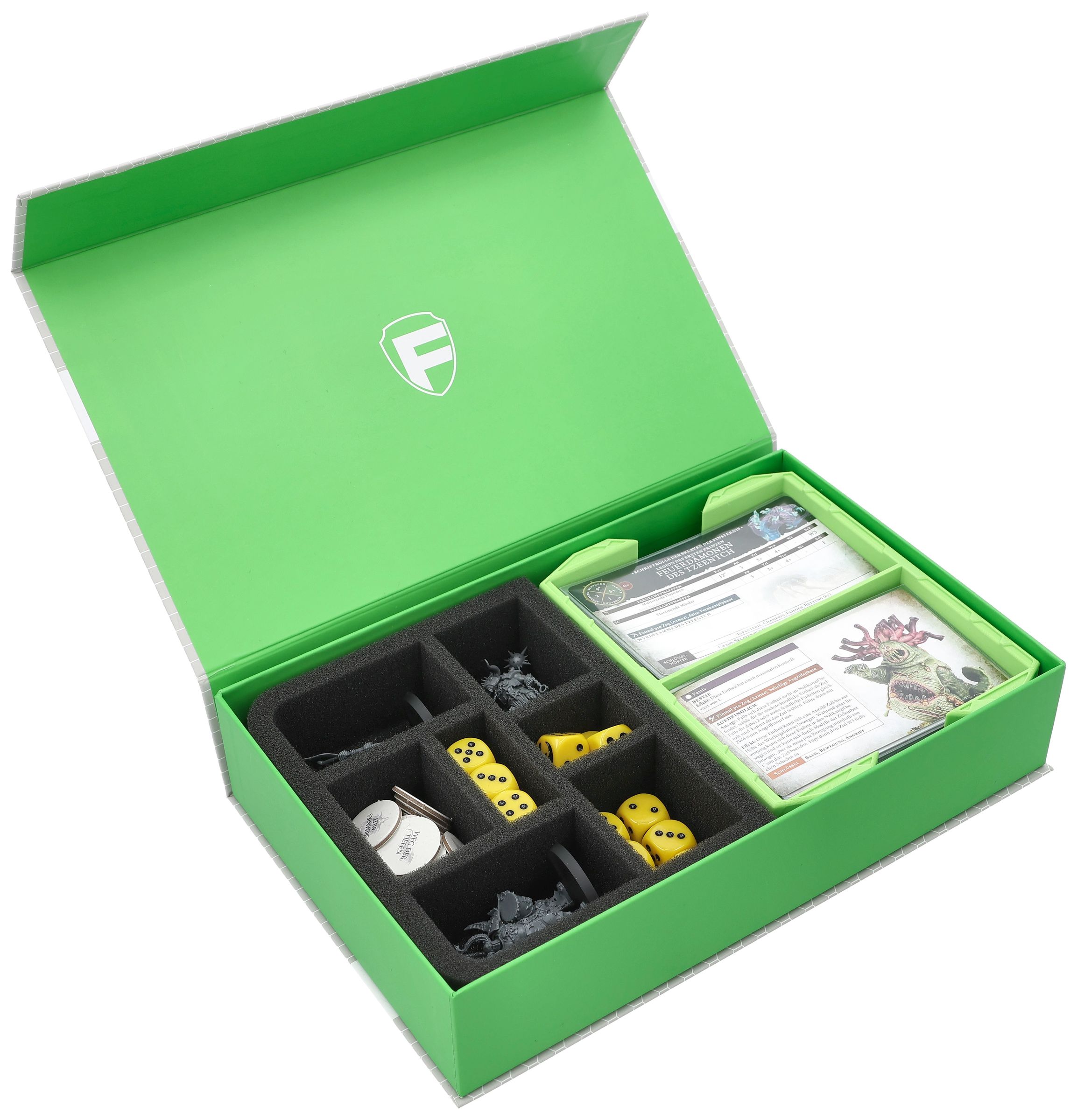 Die grüne Feldherr Magnetbox mit Kartenhalter-Insert und passgenauer Schaumstoffeinlage ist die vielseitige Lösung, um deine Warhammer Age of Sigmar Schriftrollenkarten (Warscroll Cards) sicher und übersichtlich aufzubewahren.Die Schaumstoffeinlage bietet zusätzlich Platz für Token, Würfel und Miniaturen - so hast du alle wichtigen Add-Ons sicher verstaut jederzeit griffbereit - ob beim Transport oder zuhause im Regal.