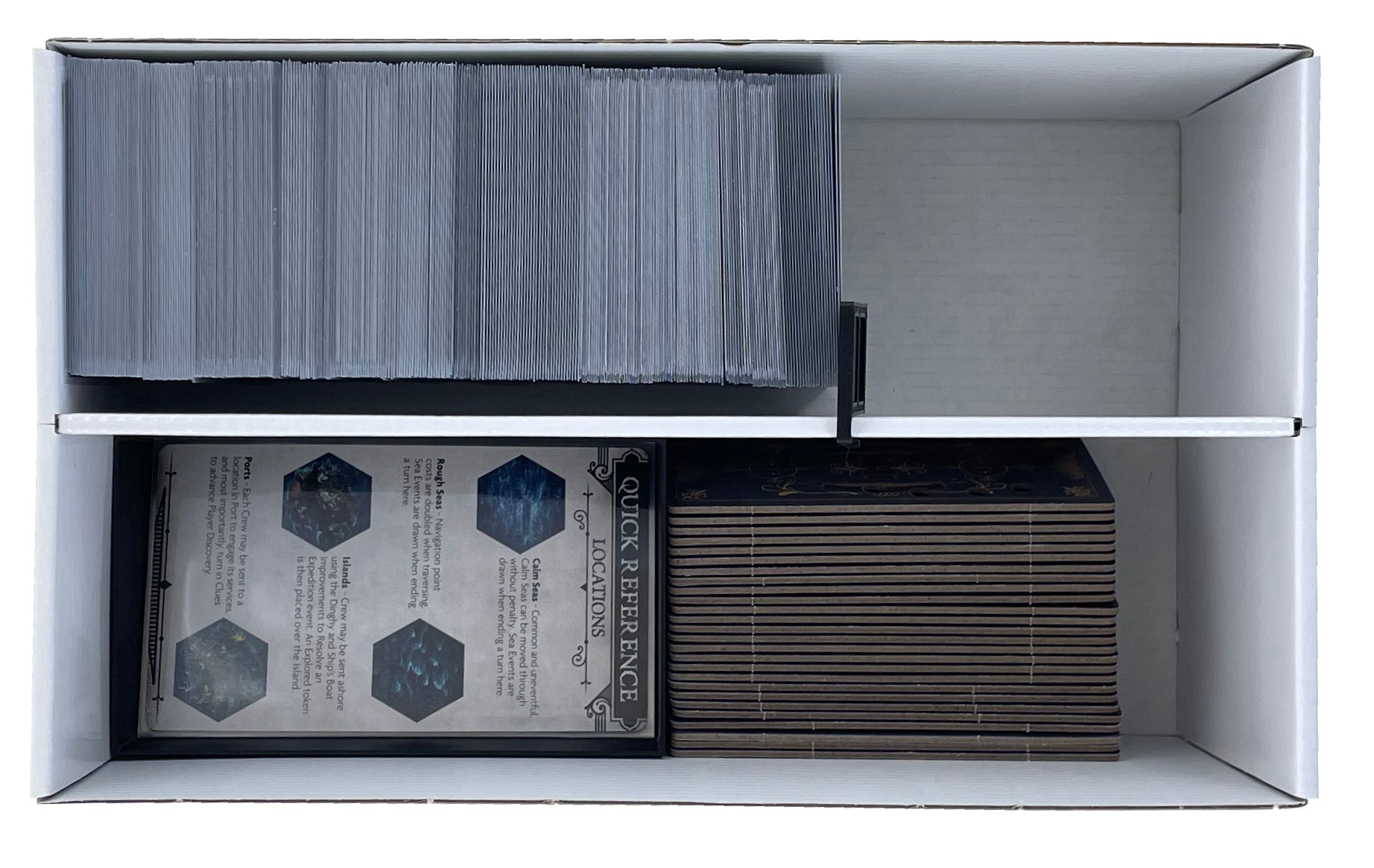 Das Spielbrett, Papp- und das Silikongameboard, Papp- und Silikon Player Ship Boards, Avatar Boards, Enemy Ship/Island Board und die Port Boards werden auf der Lagerbox in der General370 Tasche gelagert.