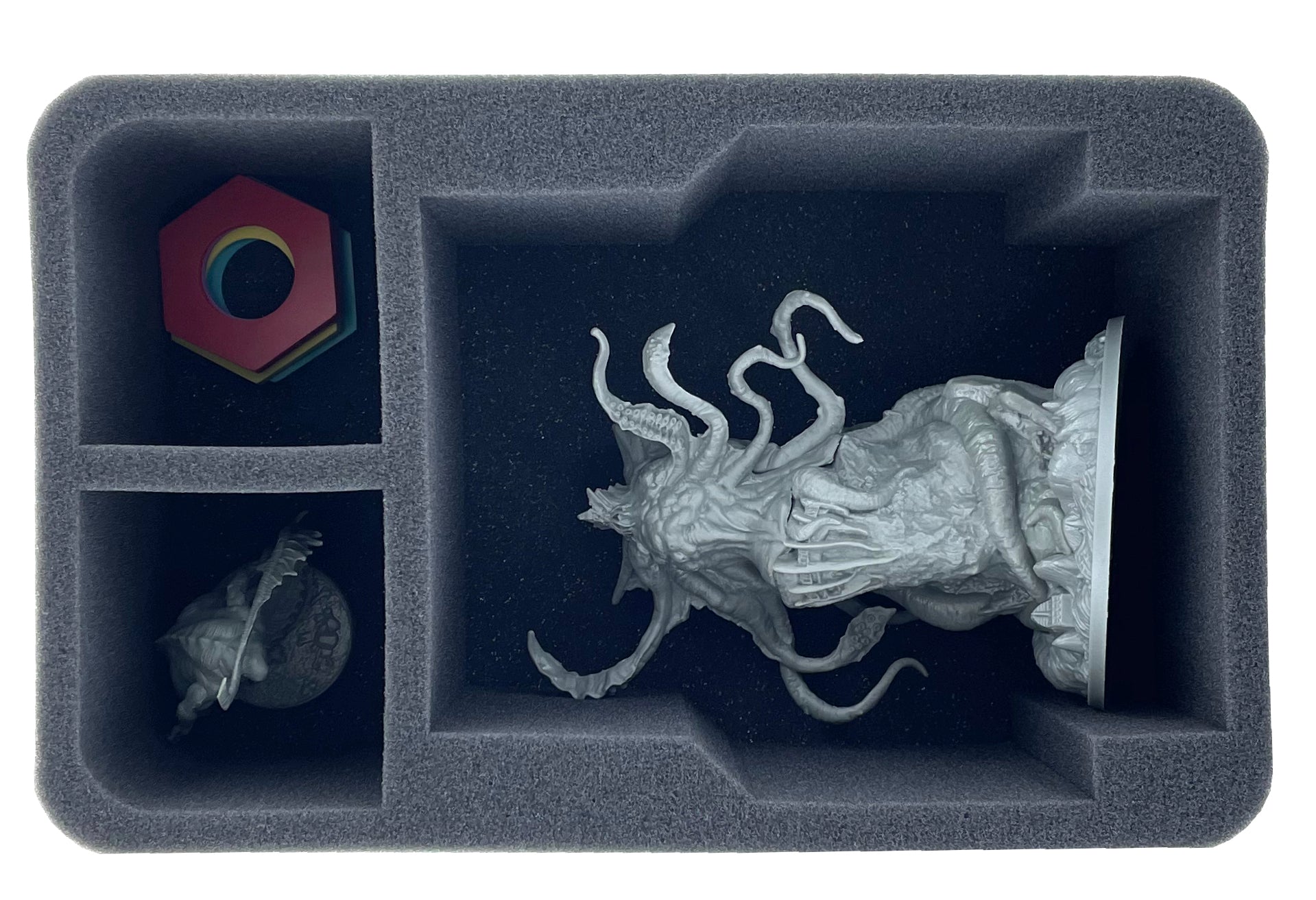- 1 Half-Size Schaumstoffeinlage mit 3 Fächern für eine große Miniatur wie den Avatar of the Old One, größere Minaturen wie Abhorrent oder Wyrm + Spielmaterial wie Clip-On Bases (HSDV110BO)