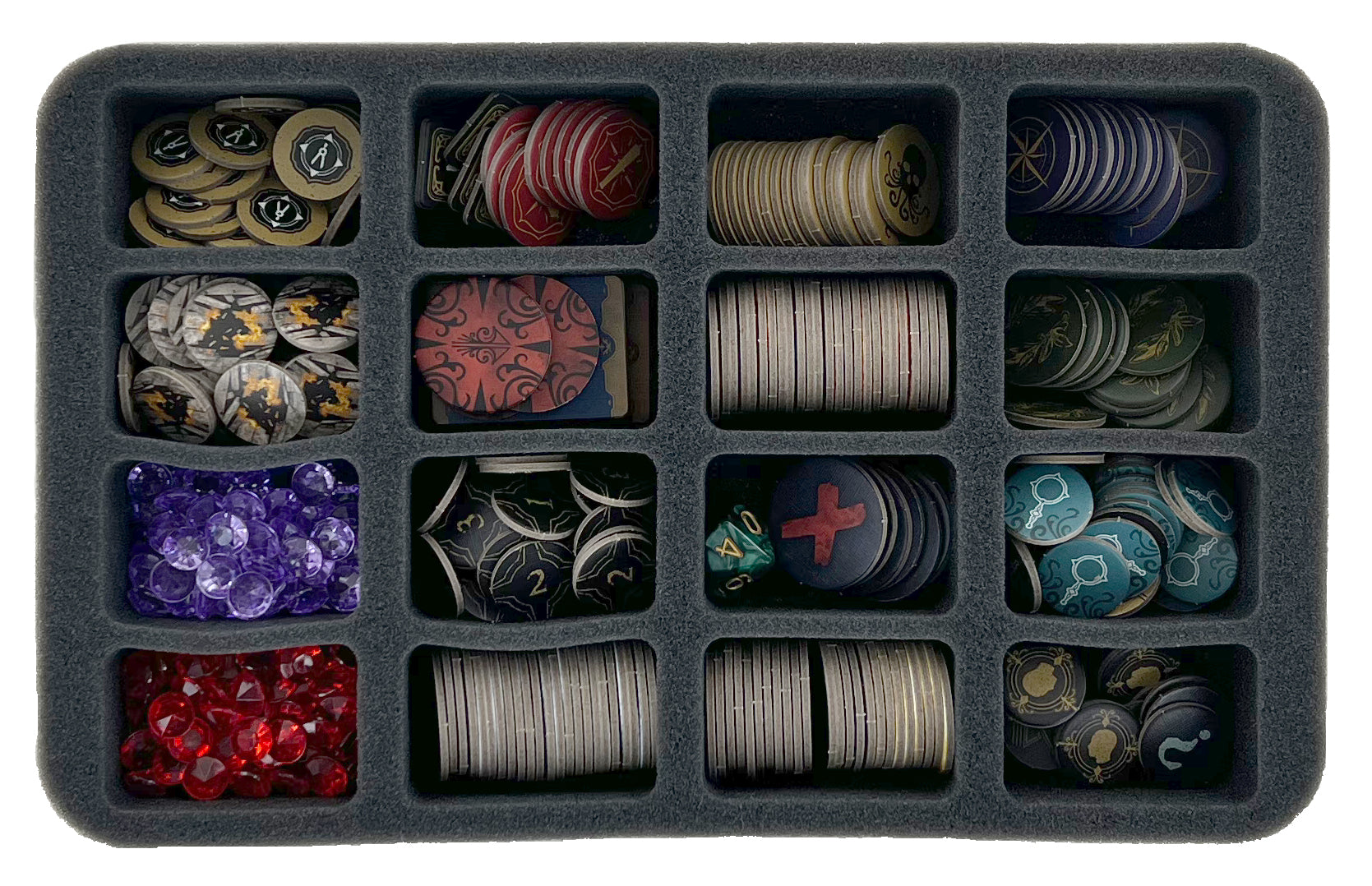 Während du Würfel und Clip Bases in die freien Fächer der Schaumstoffeinlagen einsortierst, steht für den Großteil deiner Token eine Half-Size Schaumstoffeinlage mit 16 Fächern zur Verfügung. Wie du dein Spielmaterial dort einsortierst, bestimmst du.