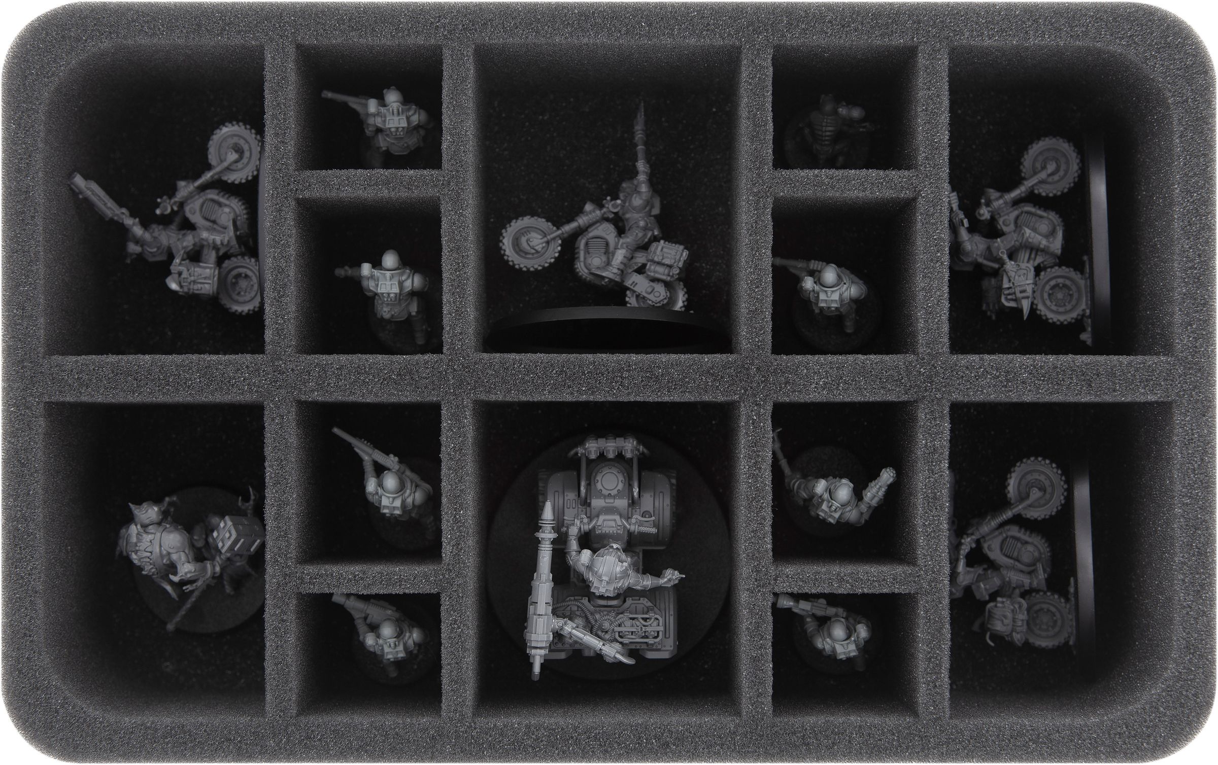 In dieser Half-Size-Schaumstoffeinlage finden bis zu 14 Symbionten-Krieger einen sicheren Platz. Die unterschiedlich großen Fächer eignen sich sowohl für Standard-Krieger-Modelle auf 25 mm Base, als auch für größere Figuren der Genestealer Cults.