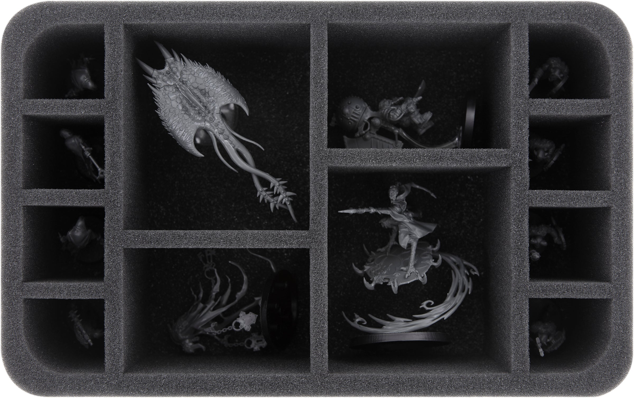 Vier Half-Size Schaumstoffeinlagen bieten deinen Modellen optimalen Schutz. Jedes Modell erhält ein eigenes, passgenaues Fach. Der hochwertige Schaumstoff sorgt dafür, dass selbst beim Transport durch den Warp, die Miniaturen sicher an ihrem Platz bleiben. Empfindliche Details wie Waffen, Hörner und Stacheln sind bestens vor Schäden geschützt sind. Auch die Farben deiner Modelle bleiben erhalten und sind sicher vor Abrieb und abplatzender Farbe.
