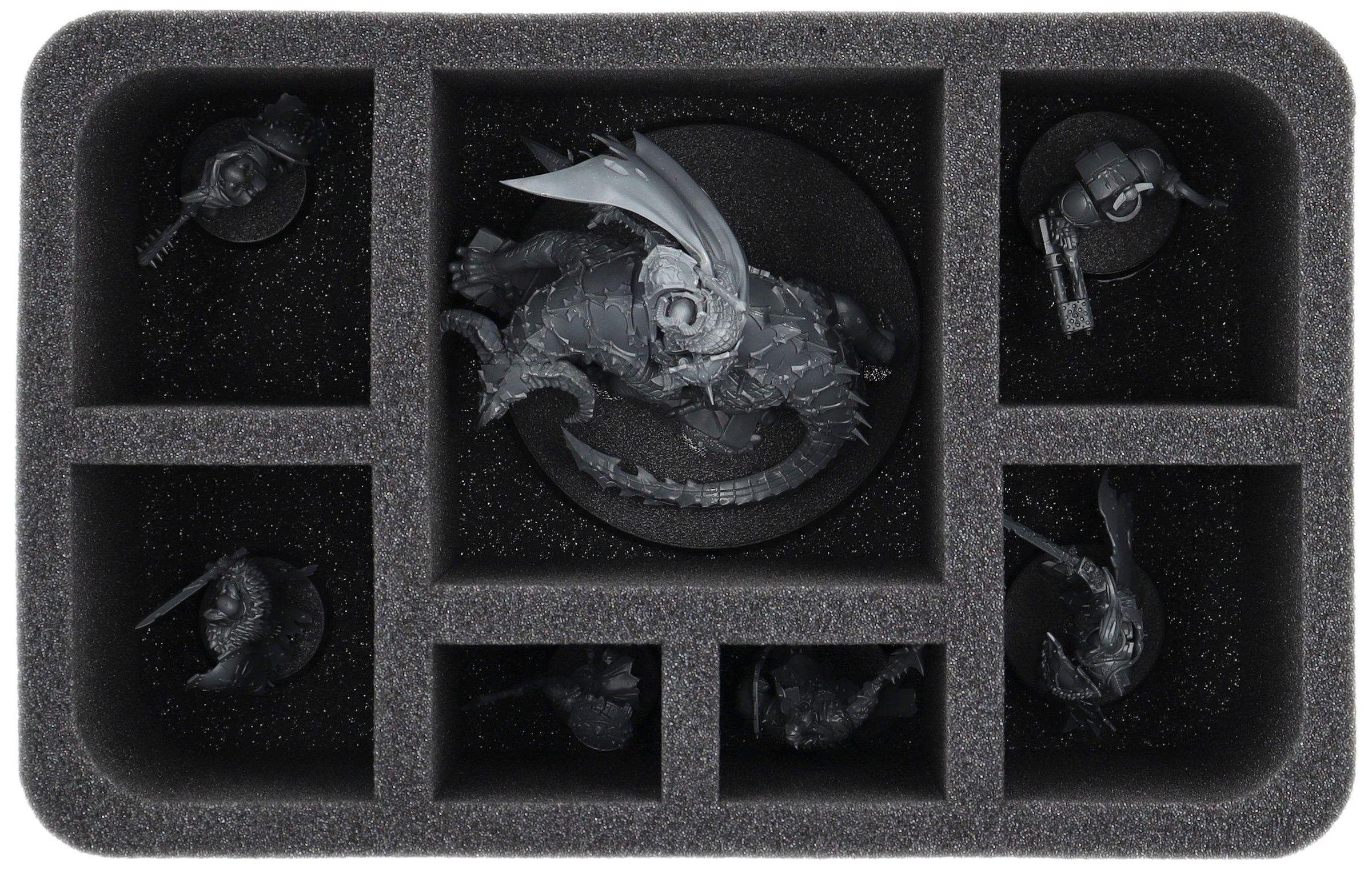 Auf dieser Feldherr Schaumstoffeinlage hast du Platz für bis zu 7 Miniaturen deiner Armee. Das Insert eignet sich zum Beispiel besonders gut zum Aufbewahren des Abraxia, Speer des Ewig Auserwählten und Modellen mit ähnlichen Abmessungen.