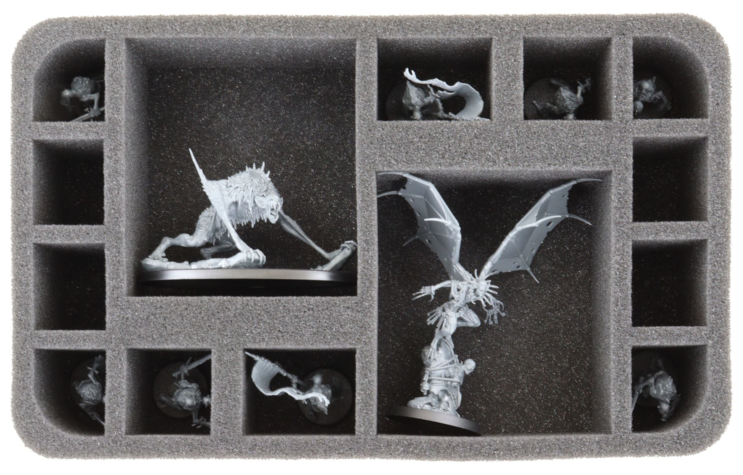 Auf dieser Feldherr-Schaumstoffeinlage hast du Platz für insgesamt 14 Miniaturen deiner Flesh-eater Courts Armee. Die großen Fächer eignen sich hervorragend zur Aufbewahrung von Charaktermodellen, wie beispielsweise einem Scheußlicher Bluthüter oder Varghulf-Höfling.