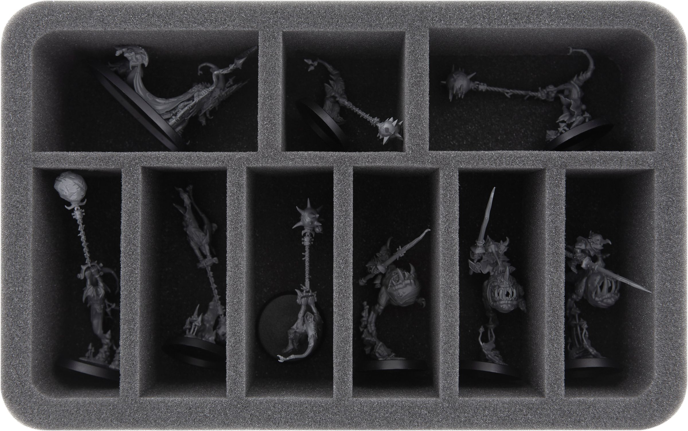 Die Einlage für Squig Hoppers, Fanatics und Skagrott the Loonking verfügt über 9 Fächer unterschiedlicher Größen. Hier kannst du deine länglichen Gloomspite Gitz Modelle sicher und ordentlich aufbewahren.