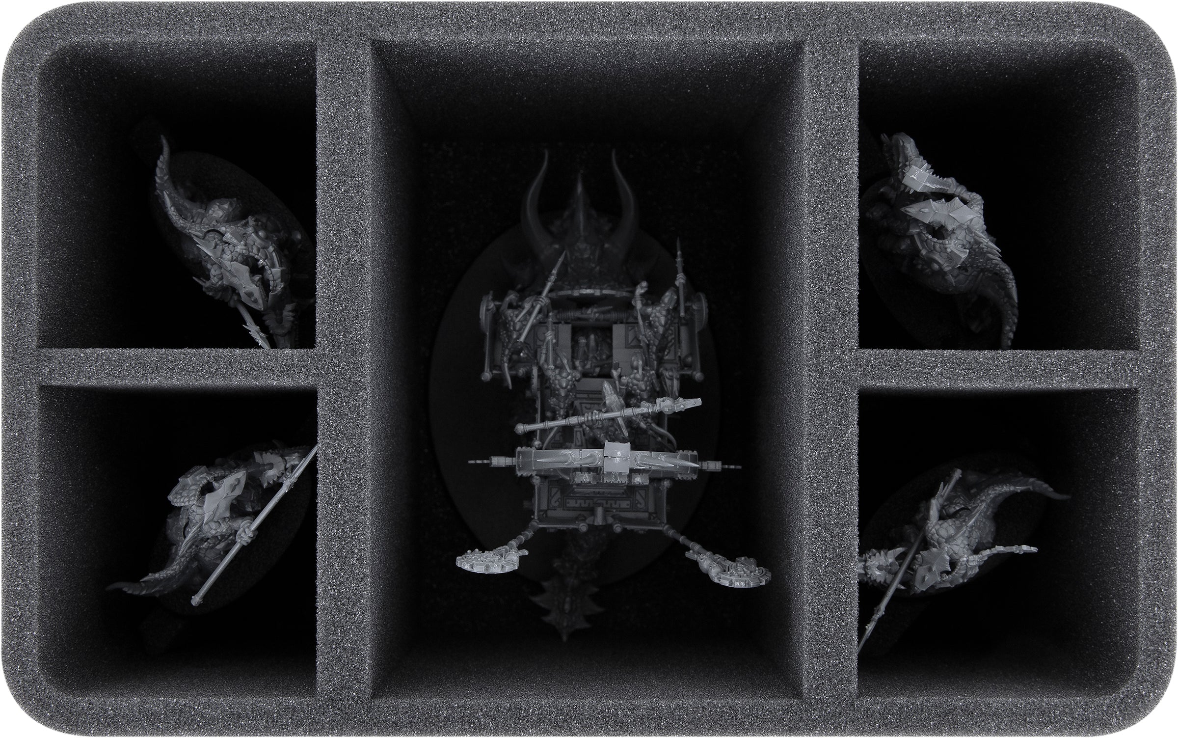 In dem großen Fach in der Mitte steht eine Engine of the Gods oder ein Stegadons sicher und komplett von Schaumstoff umgeben. Dadurch sind nicht nur die feinen, empfindlichen Teile, wie Lanzen bestens vor Beschädigungen geschützt. Auch die Farben und Abziehbilder der fertig kolorierten Miniatur bleiben unversehrt.