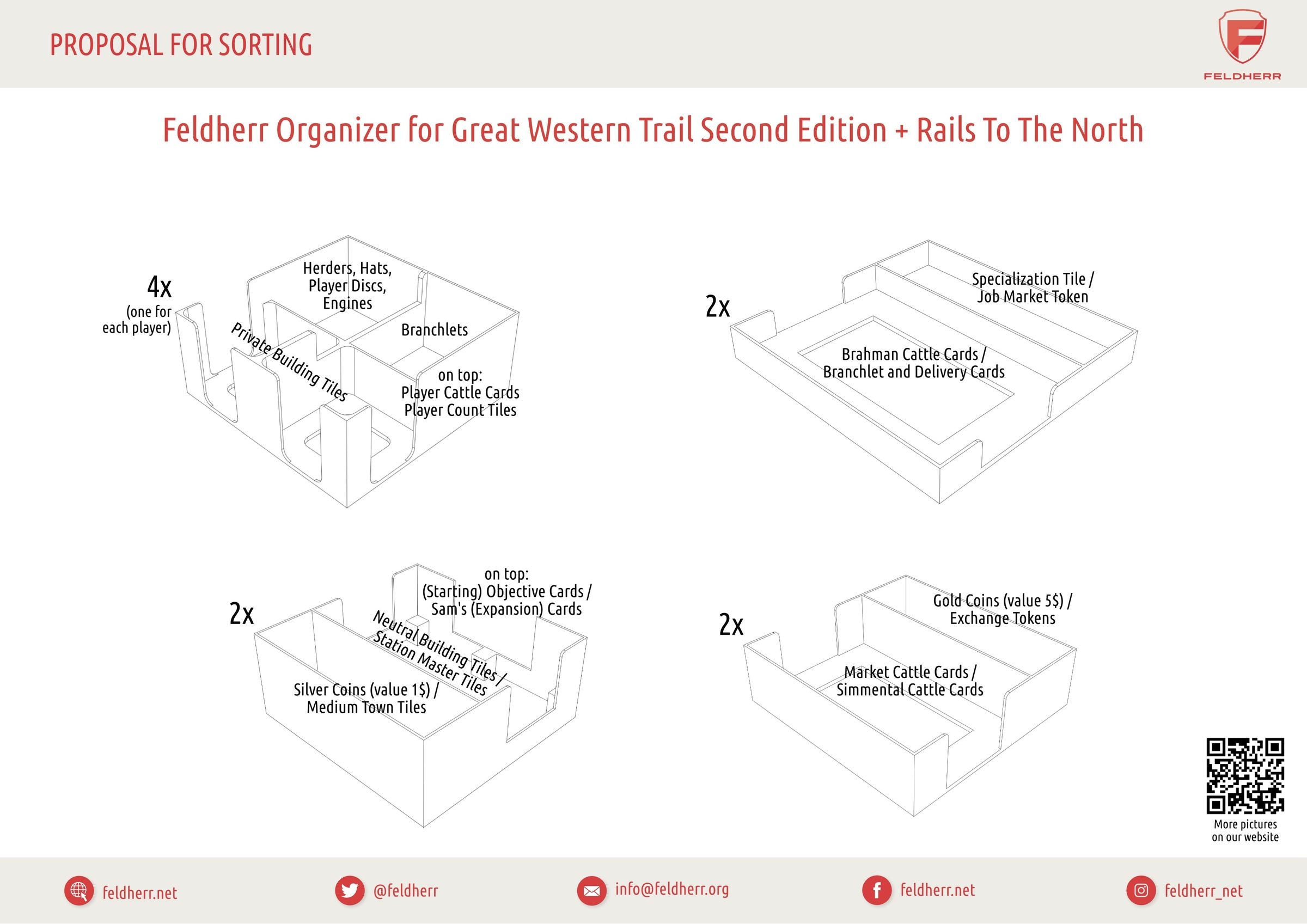 Egal, ob du die 2. Edition von „Great Western Trail“ mit oder ohne Erweiterung „Rails to the North“ spielst oder die Viehzucht in „Great Western Trail: Argentinien“ betreibst – mit diesem Organizer schaffst du nicht nur Ordnung in der Spielbox, sondern auch auf dem Spieltisch. Entfessele den Cowboy/Gaucho in dir und dominiere die Viehzucht mit diesem Organizer.