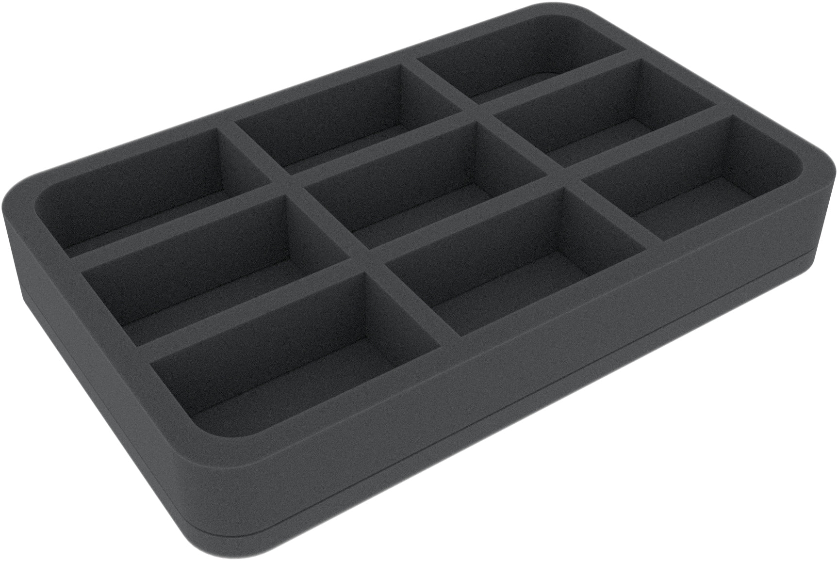 Diese Half-Size-Schaumstoffeinlage ist unterteilt in 9 Fächer gleicher Größe. Sie eignet sich besonders gut zum sicheren Aufbewahren von kleinen bis mittelgroßen Figuren für verschiedene Brettspiele und Tabletop-Systeme. Auch Spielmaterial oder andere Kleinteile lassen sich hier ordentlich verstauen.