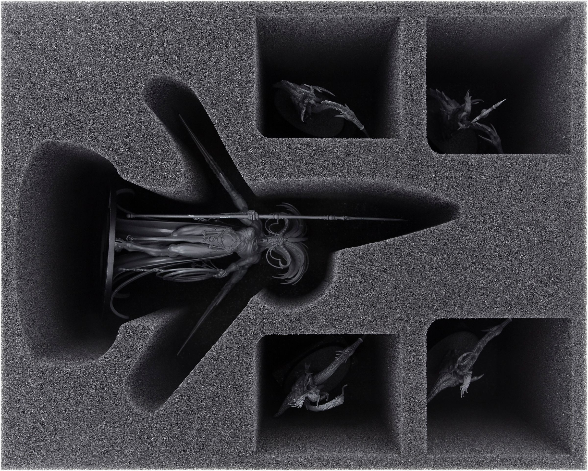 - 4 Full-Size-Schaumstoffeinlagen mit jeweils 5 Fächern für z. B. Keeper of Secrets oder Shalaxi Helbane + ausladene Miniaturen wie Infernal Enrapturess, Fiends, Daemonettes, Standartenträger, Musiker (FSMEOG135BO)