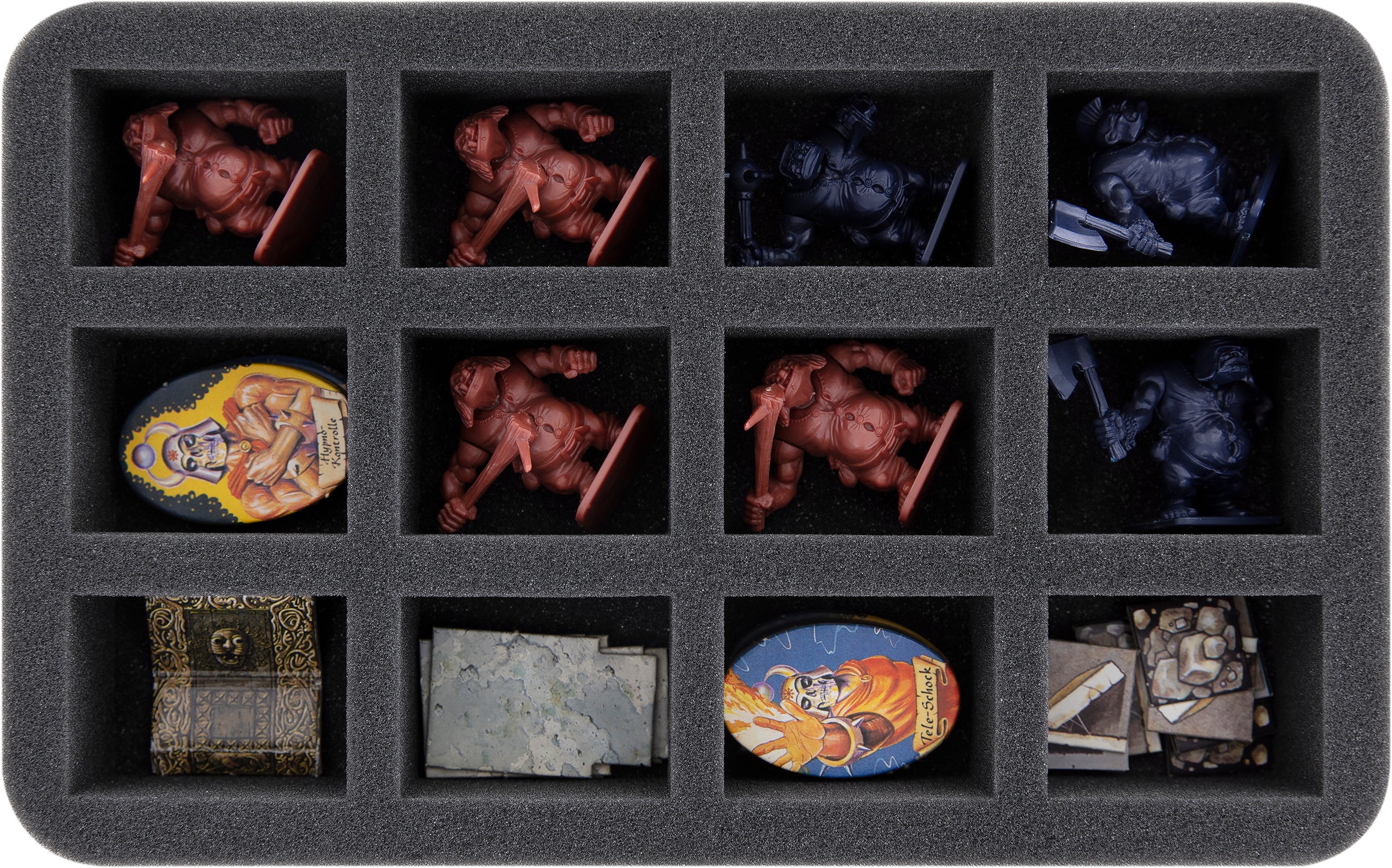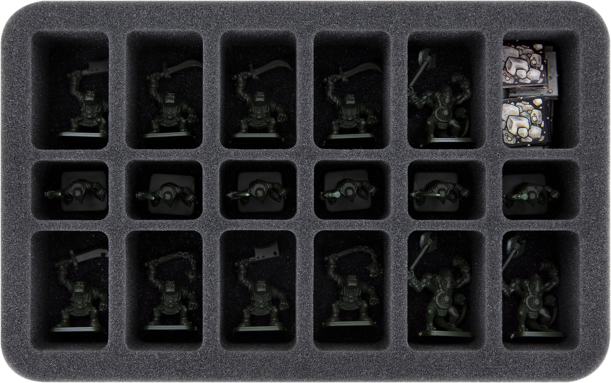 Alle 56 Miniaturen aus den vier Erweiterung finden auf 6 Schaumstoffeinlagen einen sicheren Platz. Vom klobigen Ogre, über den Orkschamanen mit ausgebreiteten Armen, bis hin zu den Landsknechten – für jede Miniatur haben wir das passende Fach parat.