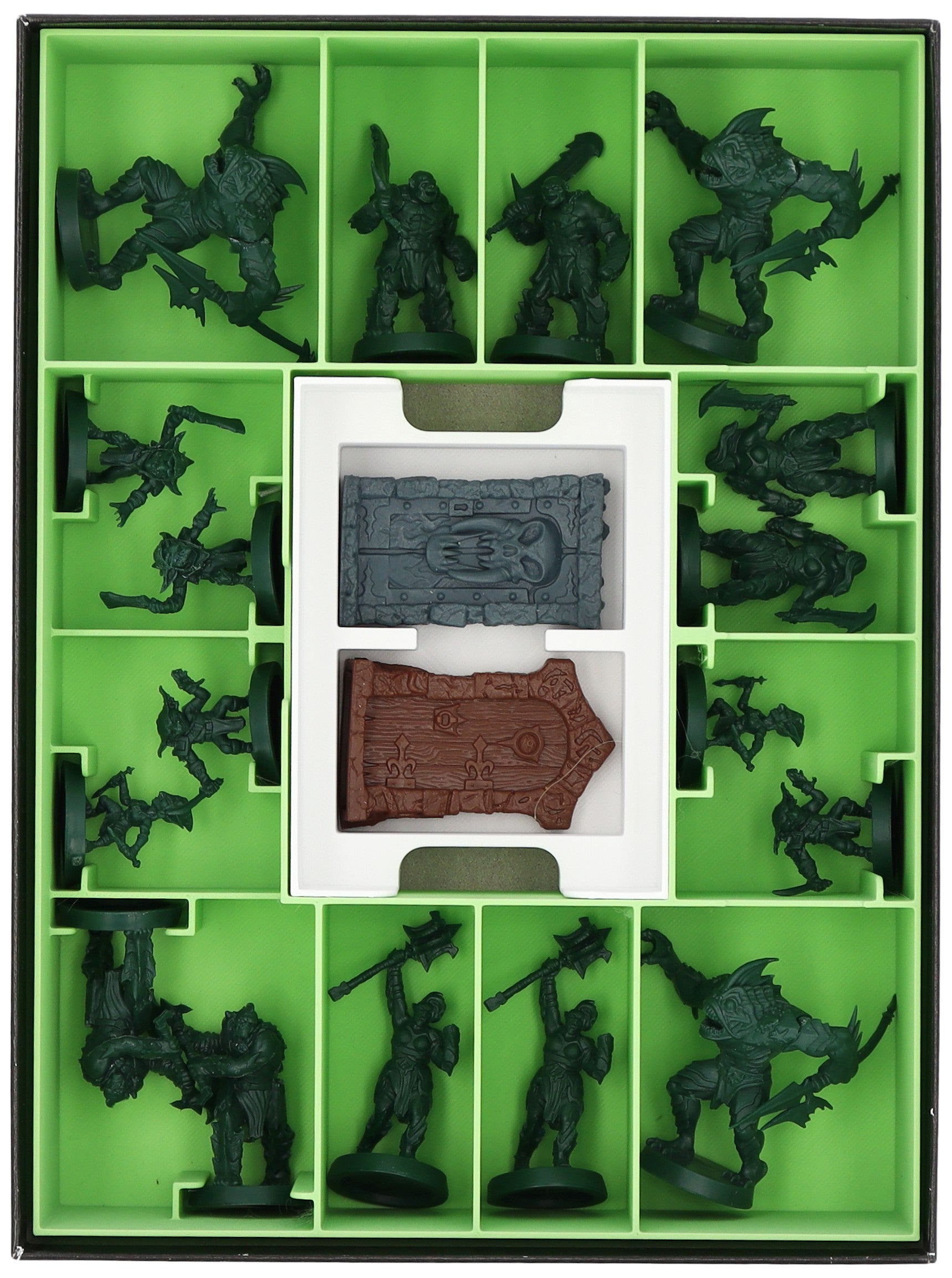 - Die Miniaturen werden einzeln in die entsprechenden Fächer einsortiert. Token und Karten kommen jeweils in ein eigenes Tray.