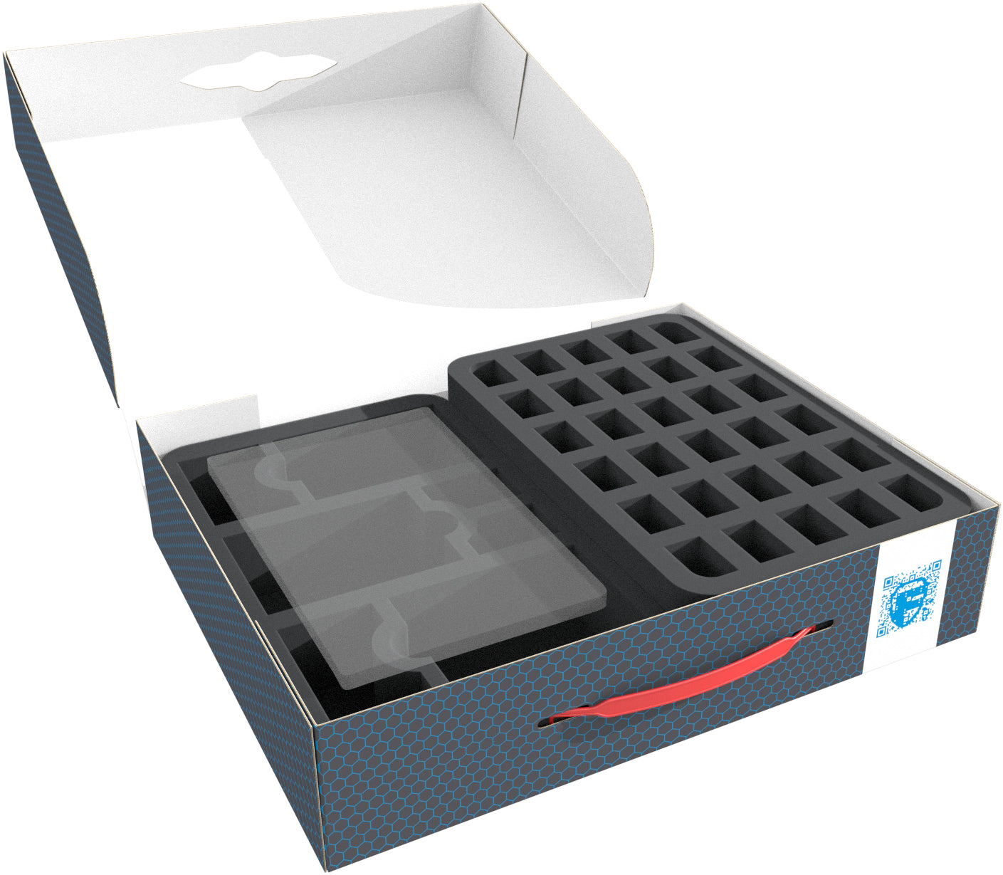 Die Lagerbox FSLB075 besteht aus beschichtetem, doppelwelligem Karton. Dadurch ist sie nicht nur angenehm leicht, sondern auch besonders reißfest und stabil. So kannst du deine Miniaturen sicher und staubgeschützt aufbewahren, mit dem praktischen Tragegriff aus Kunststoff auch mühelos transportieren.